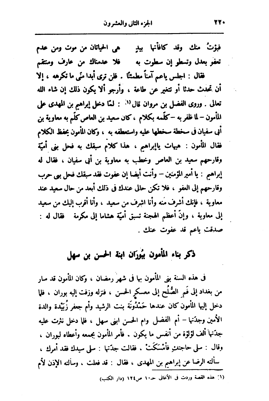 فى هذه السنة بنى المأمون بها فى شهر رمضان، وكان المأمون قد سار من بغداد إلى فم الصّلح إلى معسكر الحسن، فنزله وزفت إليه بوران، فلما دخل إليها المأمون كان عندها حمدونة بنت الرشيد وأم جعفر زبيدة والدة الأمين وجدّتها- أم الفضل وام الحسن ابنى سهل، فلما دخل نثرت عليه جدّتها ألف لؤلؤة من أنفس ما يكون، فأمر المأمون بجمعه وأعطاه لبوران، وقال: سلى حاجتك فأمسكت، فقالت جدّتها: سلى سيدك فقد أمرك، سألته الرضا عن إبراهيم بن المهدى، فقال: قد فعلت، وسألته الإذن لأم
