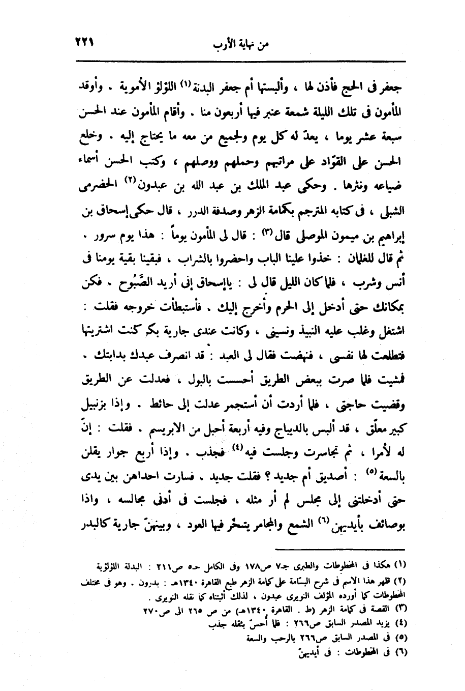 جعفر فى الحج فأذن لها، وألبستها أم جعفر البدنة «1» اللؤلؤ الأموية، وأوقد المأمون فى تلك الليلة شمعة عنبر فيها أربعون منا، وأقام المأمون عند الحسن سبعة عشر يوما، يعدّ له كل يوم ولجميع من معه ما يحتاج إليه، وخلع الحسن على القوّاد على مراتبهم وحملهم ووصلهم، وكتب الحسن أسماء ضياعه ونثرها. وحكى عبد الملك بن عبد الله بن عبدون «2» الحضرمى الشبلى، فى كتابه المترجم بكمامة الزهر وصدفة الدرر، قال حكى إسحاق بن إبراهيم بن ميمون الموصلى قال «3» : قال لى المأمون يوما: هذا يوم سرور، ثم قال للغلمان: خذوا علينا الباب واحضروا بالشراب، فبقينا بقية يومنا فى أنس وشرب، فلما كان الليل قال لى: يا إسحاق إنى أريد الصّبوح، فكن بمكانك حتى أدخل إلى الحرم وأخرج إليك، فأستبطأت خروجه فقلت: