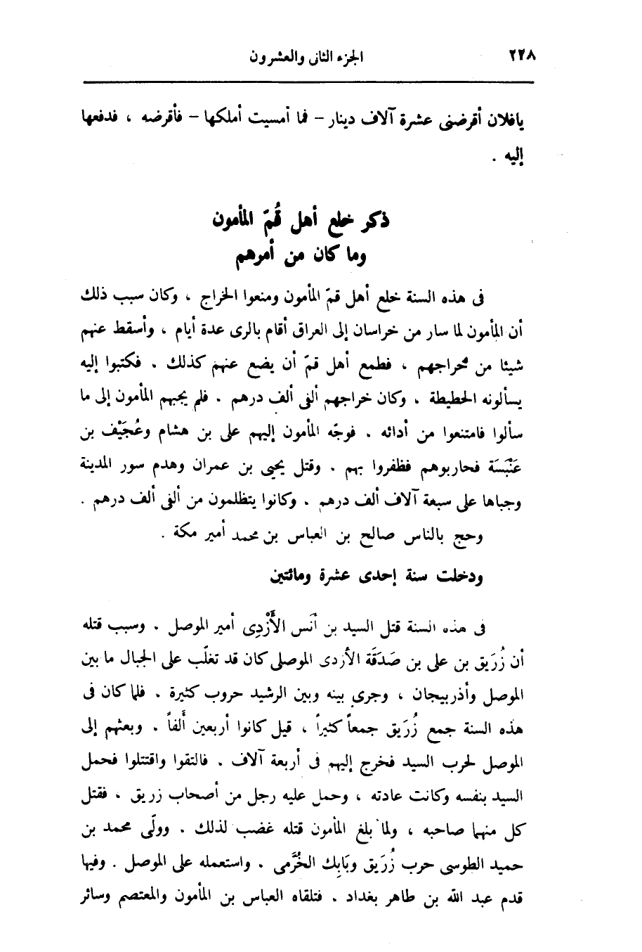 فى هذه السنة قتل السيد بن أنس الأزدى أمير الموصل، وسبب قتله أن زريق بن على بن صدقة الأزدى الموصلى كان قد تغلّب على الجبال ما بين الموصل وأذربيجان، وجرى بينه وبين الرشيد حروب كثيرة، فلما كان فى هذه السنة جمع زريق جمعا كثيرا، قيل كانوا أربعين ألفا، وبعثهم إلى الموصل لحرب السيد فخرج إليهم فى أربعة آلاف، فالتقوا واقتتلوا فحمل السيد بنفسه وكانت عادته، وحمل عليه رجل من أصحاب زريق، فقتل كل منهما صاحبه، ولما بلغ المأمون قتله غضب لذلك، وولّى محمد بن حميد الطوسى حرب زريق وبابك الخرّمى، واستعمله على الموصل. وفيها قدم عبد الله بن طاهر بغداد. فتلقاه العباس بن المأمون والمعتصم وسائر