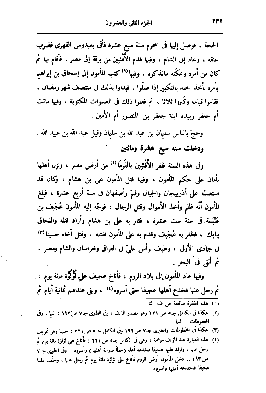 الحجة، فوصل إليها فى المحرم سنة سبع عشرة فأتى بعبدوس الفهرى فضرب عنقه، وعاد إلى الشام، وفيها قدم الأفشين من برقة إلى مصر، فأقام بها ثم كان من أمره وتمكّنه ما نذكره، وفيها «1» كتب المأمون إلى إسحاق بن إبراهيم يأمره بأخذ الجند بالتكبير إذا صلّوا، فبداوا بذلك فى منتصف شهر رمضان، فقاموا قيامه وكبروا ثلاثا، ثم فعلوا ذلك فى الصلوات المكتوبة، وفيها ماتت أم جعفر زبيدة ابنة جعفر بن المنصور أم الأمين.