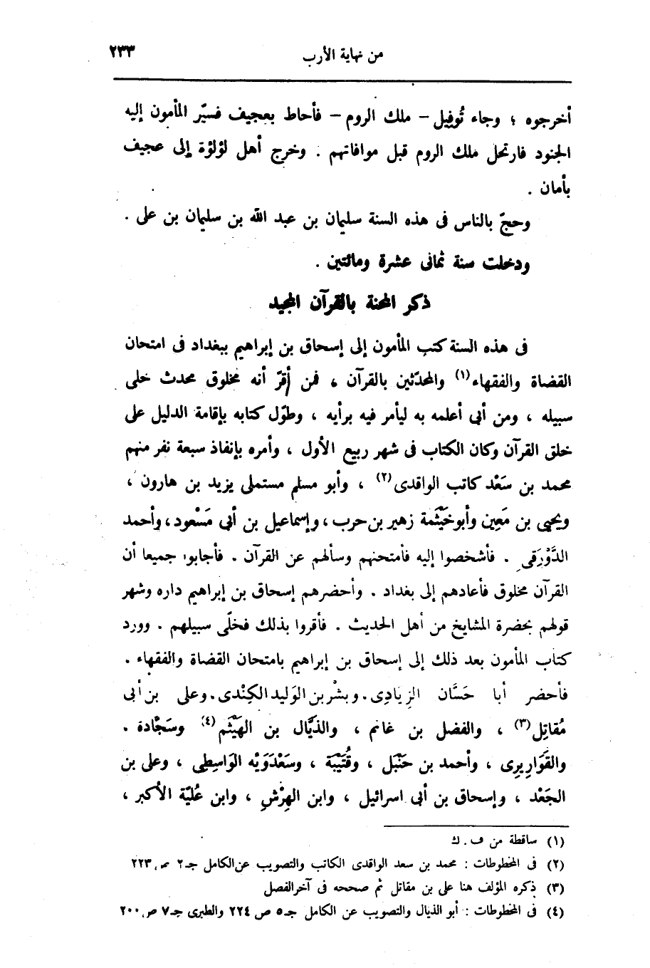 فى هذه السنة كتب المأمون إلى إسحاق بن إبراهيم ببغداد فى امتحان القضاة والفقهاء «1» والمحدّثين بالقرآن، فمن أقرّ أنه مخلوق محدث خلى سبيله، ومن أبى أعلمه به ليأمر فيه برأيه، وطوّل كتابه بإقامة الدليل على خلق القرآن وكان الكتاب فى شهر ربيع الأول، وأمره بإنفاذ سبعة نفر منهم محمد بن سعد كاتب الواقدى «2» ، وأبو مسلم مستملى يزيد بن هارون، ويحيى بن معين وأبو خيثمة زهير بن حرب، وإسماعيل بن أبى مسعود، وأحمد الدّورقى. فأشخصوا إليه فأمتحنهم وسألهم عن القرآن، فأجابوا جميعا أن القرآن مخلوق فأعادهم إلى بغداد، وأحضرهم إسحاق بن إبراهيم داره وشهر قولهم بحضرة المشايخ من أهل الحديث. فأقروا بذلك فخلّى سبيلهم، وورد كتاب المأمون بعد ذلك إلى إسحاق بن إبراهيم بامتحان القضاة والفقهاء.