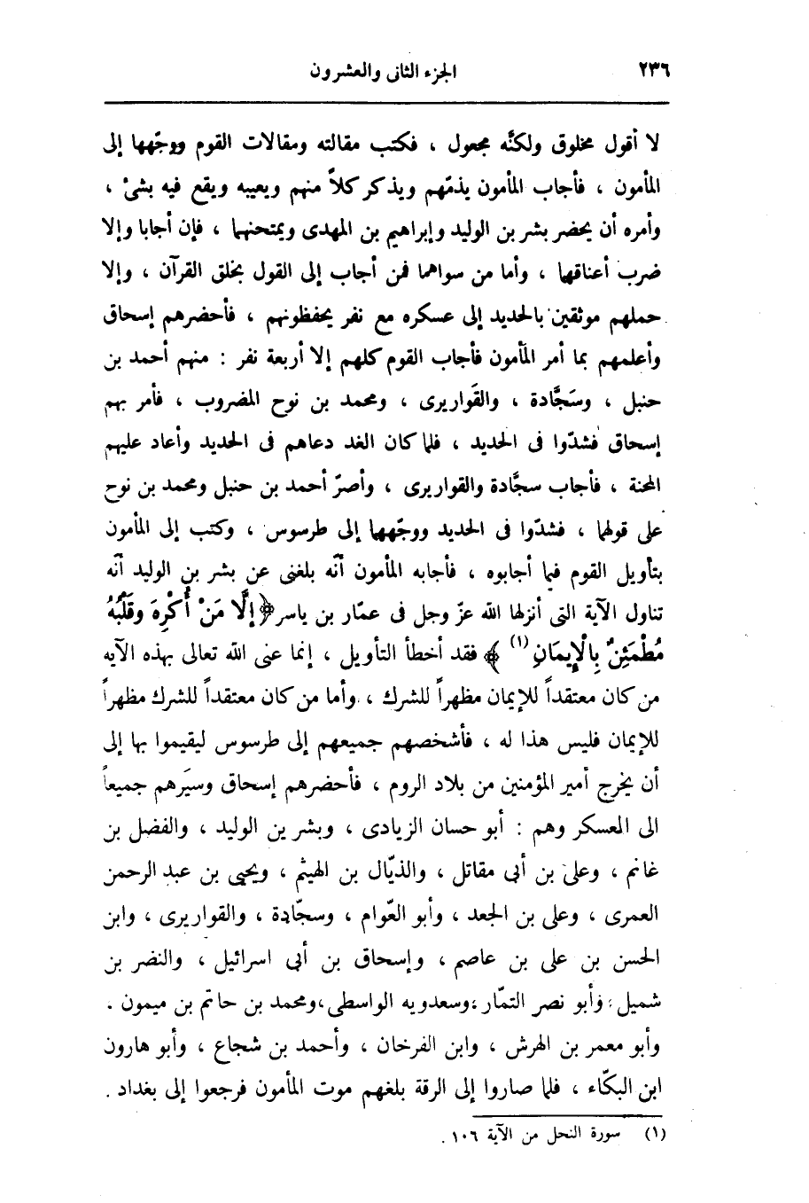 فقد أخطأ التأويل، إنما عنى الله تعالى بهذه الآية من كان معتقدا للإيمان مظهرا للشرك، وأما من كان معتقدا للشرك مظهرا للإيمان فليس هذا له، فأشخصهم جميعهم إلى طرسوس ليقيموا بها إلى أن يخرج أمير المؤمنين من بلاد الروم، فأحضرهم إسحاق وسيرهم جميعا الى العسكر وهم: أبو حسان الزيادى، وبشر بن الوليد، والفضل بن غانم، وعلى ابن أبى مقاتل، والذيّال بن الهيثم، ويحيى بن عبد الرحمن العمرى، وعلى بن الجعد، وأبو العوّام، وسجّادة، والقواريرى، وابن الحسن بن على بن عاصم، وإسحاق بن أبى اسرائيل، والنضر بن شميل: وأبو نصر التمّار، وسعدويه الواسطى، ومحمد بن حاتم بن ميمون، وأبو معمر بن الهرش، وابن الفرخان، وأحمد بن شجاع، وأبو هارون ابن البكّاء، فلما صاروا إلى الرقة بلغهم موت المأمون فرجعوا إلى بغداد.