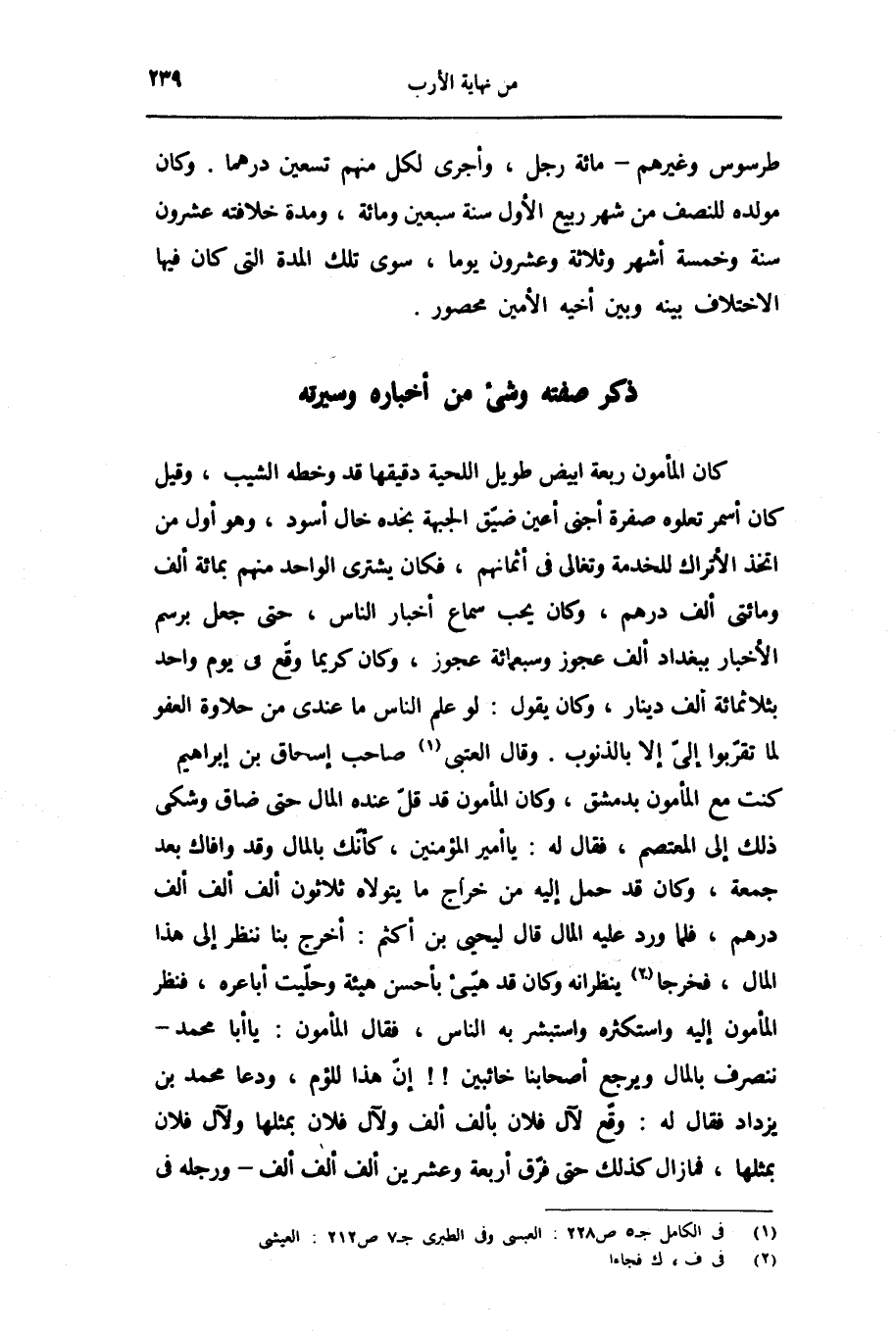 كان المأمون ربعة ابيض طويل اللحية دقيقها قد وخطه الشيب، وقيل كان أسمر تعلوه صفرة أجنى أعين ضيّق الجبهة بخده خال أسود، وهو أول من اتخذ الأتراك للخدمة وتغالى فى أثمانهم، فكان يشترى الواحد منهم بمائة ألف ومائتى ألف درهم، وكان يحب سماع أخبار الناس، حتى جعل برسم الأخبار ببغداد ألف عجوز وسبعمائة عجوز، وكان كريما وقّع فى يوم واحد بثلاثمائة ألف دينار، وكان يقول: لو علم الناس ما عندى من حلاوة العفو لما تقرّبوا إلىّ إلا بالذنوب. وقال العتبى «1» صاحب إسحاق بن إبراهيم كنت مع المأمون بدمشق، وكان المأمون قد قلّ عنده المال حتى ضاق وشكى ذلك إلى المعتصم، فقال له: يا أمير المؤمنين، كأنّك بالمال وقد وافاك بعد جمعة، وكان قد حمل إليه من خراج ما يتولاه ثلاثون ألف ألف ألف درهم، فلما ورد عليه المال قال ليحيى بن أكثم: أخرج بنا ننظر إلى هذا المال، فخرجا «2» ينظرانه وكان قد هيّئ بأحسن هيئة وحلّيت أباعره، فنظر المأمون إليه واستكثره واستبشر به الناس، فقال المأمون: يا أبا محمد- ننصرف بالمال ويرجع أصحابنا خائبين!! إنّ هذا للؤم، ودعا محمد بن يزداد فقال له: وقّع لآل فلان بألف ألف ولآل فلان بمثلها ولآل فلان بمثلها، فما زال كذلك حتى فرّق أربعة وعشرين ألف ألف ألف- ورجله فى