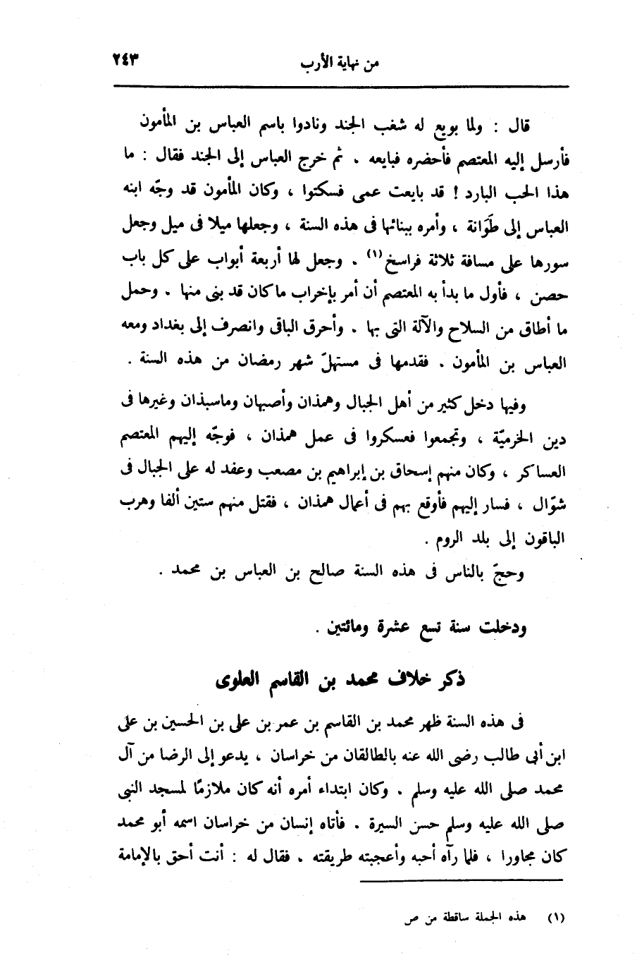 فى هذه السنة ظهر محمد بن القاسم بن عمر بن على بن الحسين بن على ابن أبى طالب رضى الله عنه بالطالقان من خراسان، يدعو إلى الرضا من آل محمد صلّى الله عليه وسلّم، وكان ابتداء أمره أنه كان ملازما لمسجد النبى صلى الله عليه وسلّم حسن السيرة، فأتاه إنسان من خراسان اسمه أبو محمد كان مجاورا، فلما رآه أحبه وأعجبته طريقته، فقال له: أنت أحق بالإمامة