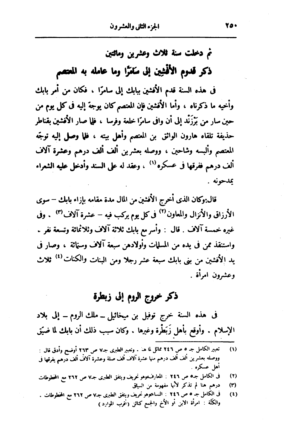 فى هذه السنة خرج توفيل بن ميخائيل- ملك الروم- إلى بلاد الإسلام، وأوقع بأهل زبطرة وغيرها، وكان سبب ذلك أن بابك لما ضيّق