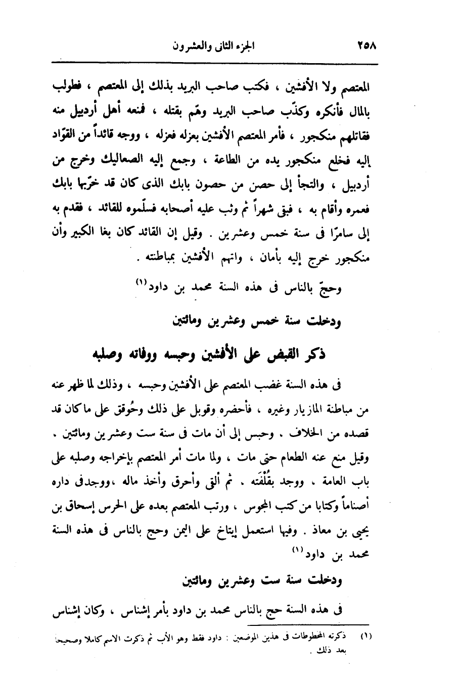 فى هذه السنة غضب المعتصم على الأفشين وحبسه، وذلك لما ظهر عنه من مباطنة المازيار وغيره، فأحضره وقوبل على ذلك وحوقق على ما كان قد قصده من الخلاف، وحبس إلى أن مات فى سنة ست وعشرين ومائتين، وقيل منع عنه الطعام حتى مات، ولما مات أمر المعتصم بإخراجه وصلبه على باب العامة، ووجد بقلفته، ثم ألقى وأحرق وأخذ ماله، ووجد فى داره أصناما وكتابا من كتب المجوس، ورتب المعتصم بعده على الحرس إسحاق بن يحيى بن معاذ. وفيها استعمل إيتاخ على اليمن وحج بالناس فى هذه السنة محمد بن داود «2»