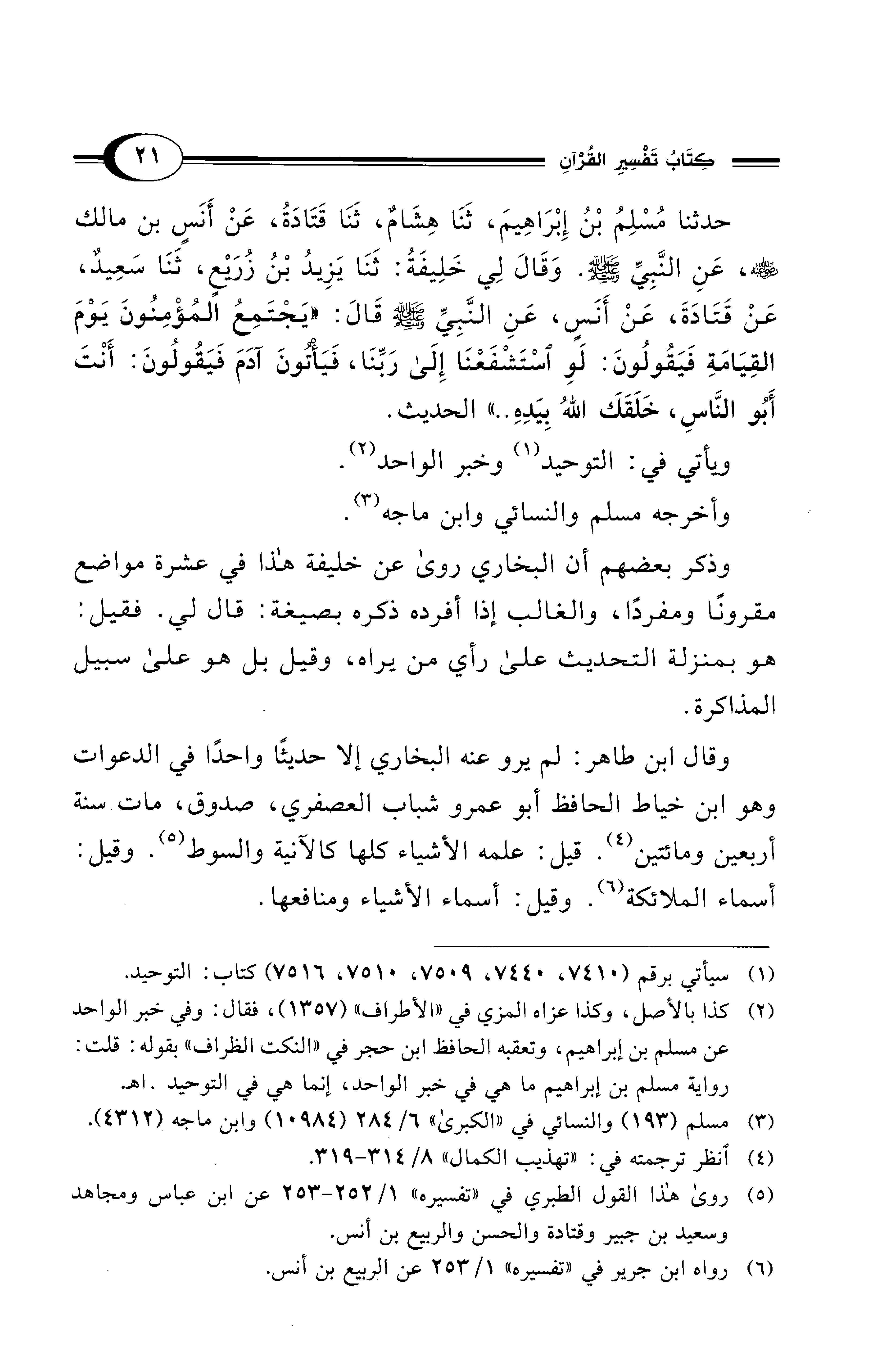 حدثنا مُسْلِمُ بْنُ إِبْرَاهِيمَ، ثَنَا هِشَامٌ، ثَنَا قَتَادَةُ، عَنْ أَنَسٍ بن مالك - رضي الله عنه -، عَنِ النَّبِيِّ - صلى الله عليه وسلم -. وَقَالَ لِي خَلِيفَةُ: ثَنَا يَزِيدُ بْنُ زُريعٍ، ثَنَا سَعِيدٌ، عَنْ قَتَادَةَ، عَنْ أَنَسٍ، عَنِ النَّبِيِّ - صلى الله عليه وسلم - قَالَ: "يَجْتَمِعُ المُؤْمِنُونَ يَوْمَ القِيَامَةِ فَيَقُولُونَ: لَوِ اسْتَشْفَعْنَا إِلَى رَبِّنَا، فَيَأْتُونَ آدَمَ فَيَقُولُونَ: أَنْتَ أَبُو النَّاسِ، خَلَقَكَ اللهُ بِيَدِهِ .. " الحديث.