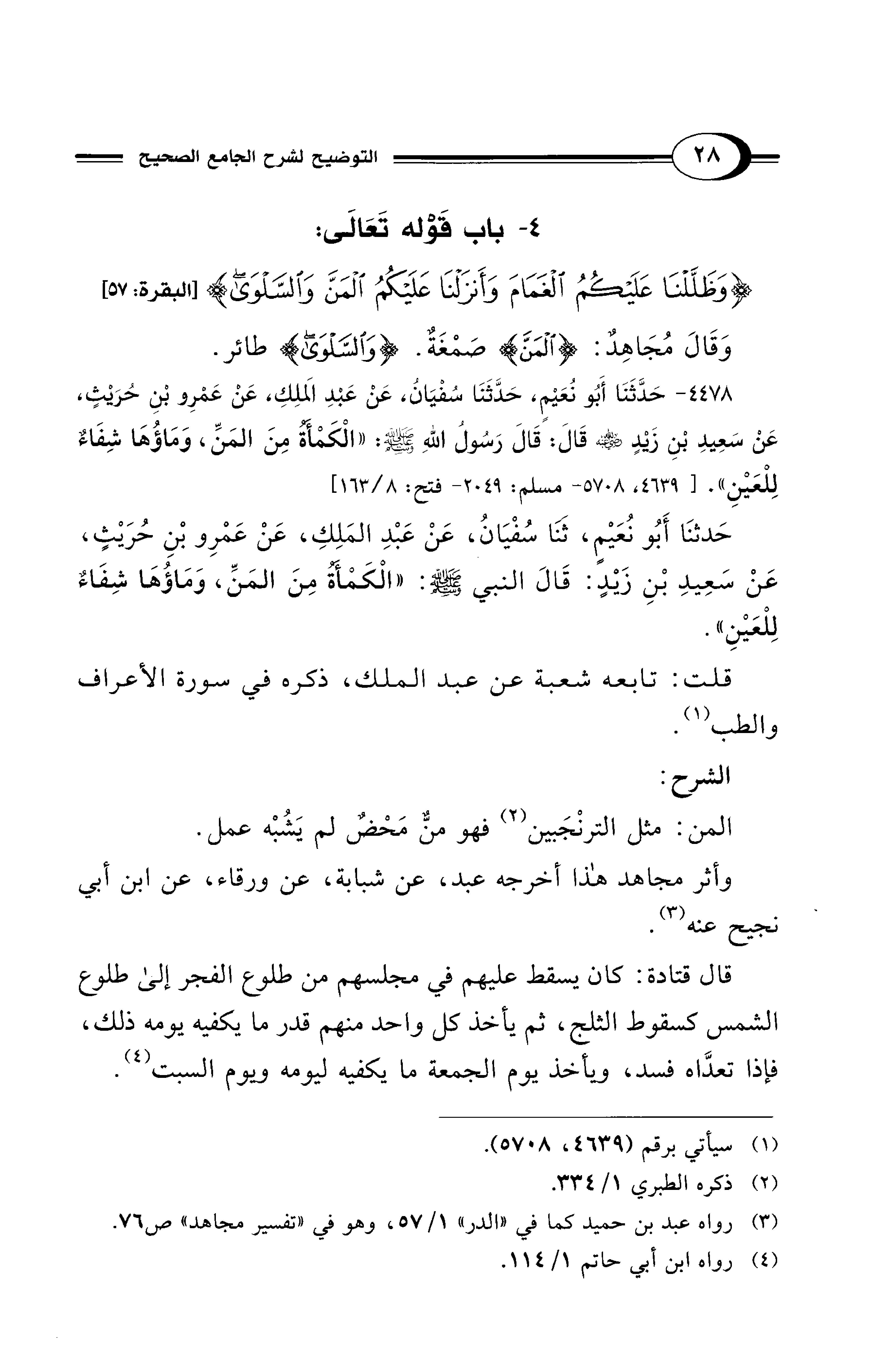 4 - باب قَوْله تَعَالَى: {وَظَلَّلْنَا عَلَيْكُمُ الْغَمَامَ وَأَنْزَلْنَا عَلَيْكُمُ الْمَنَّ وَالسَّلْوَى} [البقرة:57]