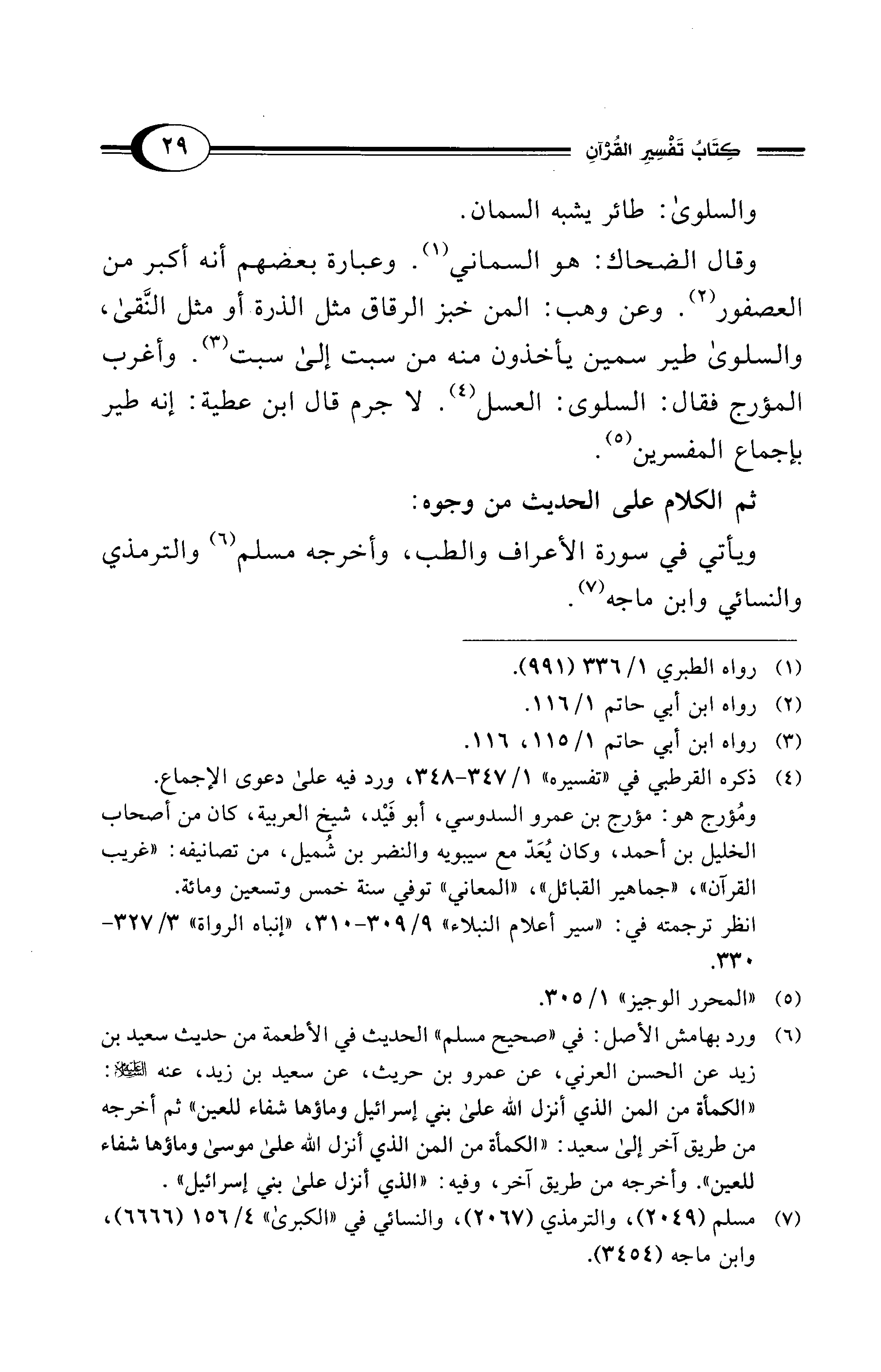 وقال الضحاك: هو السماني (¬1). وعبارة بعضهم أنه أكبر من العصفور (¬2). وعن وهب: المن خبز الرقاق مثل الذرة أو مثل النَّقى، والسلوى طير سمين يأخذون منه من سبت إلى سبت (¬3). وأغرب المؤرج فقال: السلوى: العسل (¬4). لا جرم قال ابن عطية: إنه طير بإجماع المفسرين (¬5).