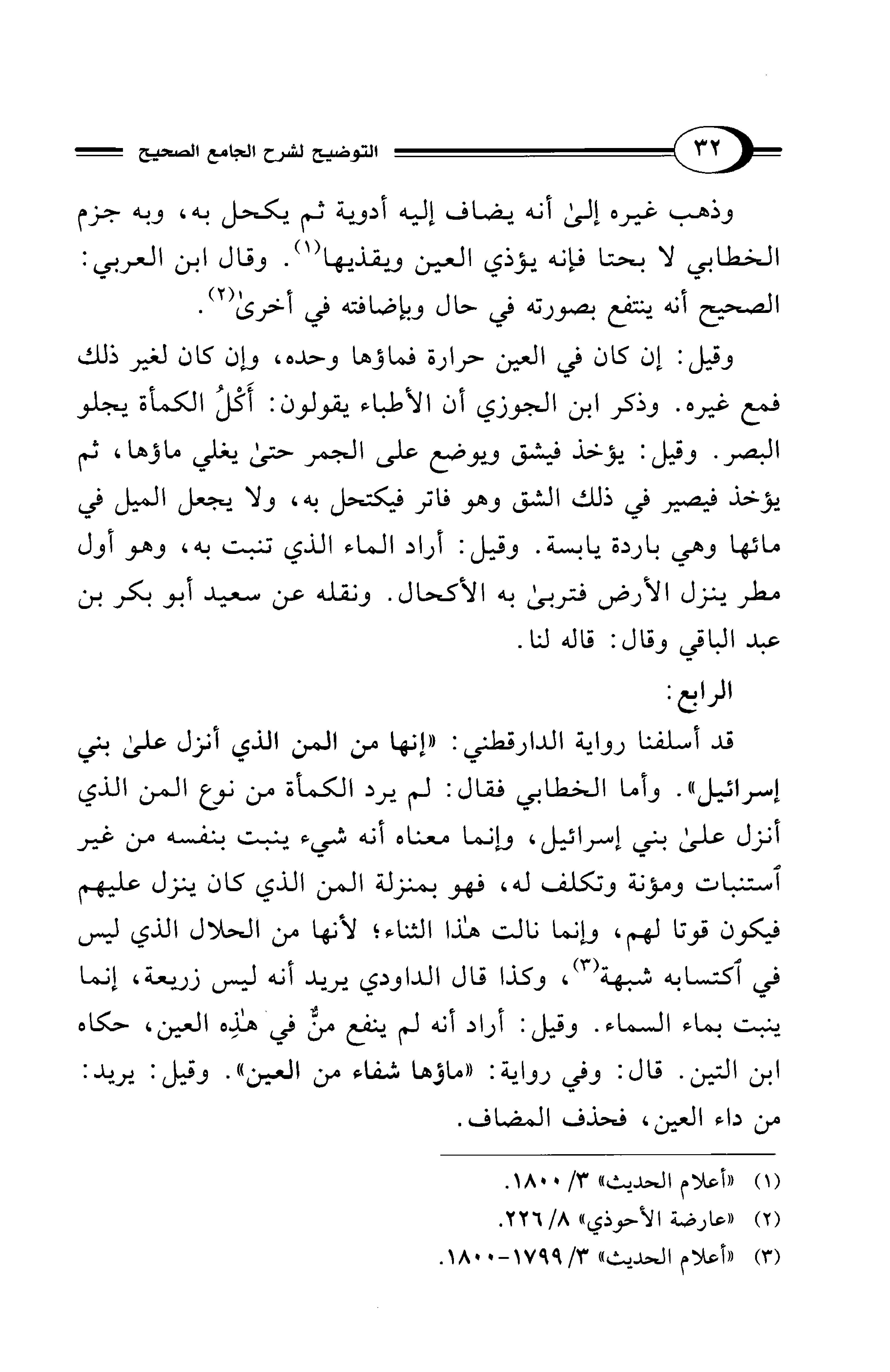 وقيل: إن كان في العين حرارة فماؤها وحده، وإن كان لغير ذلك فمع غيره. وذكر ابن الجوزي أن الأطباء يقولون: أَكْلُ الكمأة يجلو البصر. وقيل: يؤخذ فيشق ويوضع على الجمر حتى يغلي ماؤها، ثم يؤخذ فيصير في ذلك الشق وهو فاتر فيكتحل به، ولا يجعل الميل في مائها وهي باردة يابسة. وقيل: أراد الماء الذي تنبت به، وهو أول مطر ينزل الأرض فتربى به الأكحال. ونقله عن سعيد أبو بكر بن عبد الباقي وقال: قاله لنا.