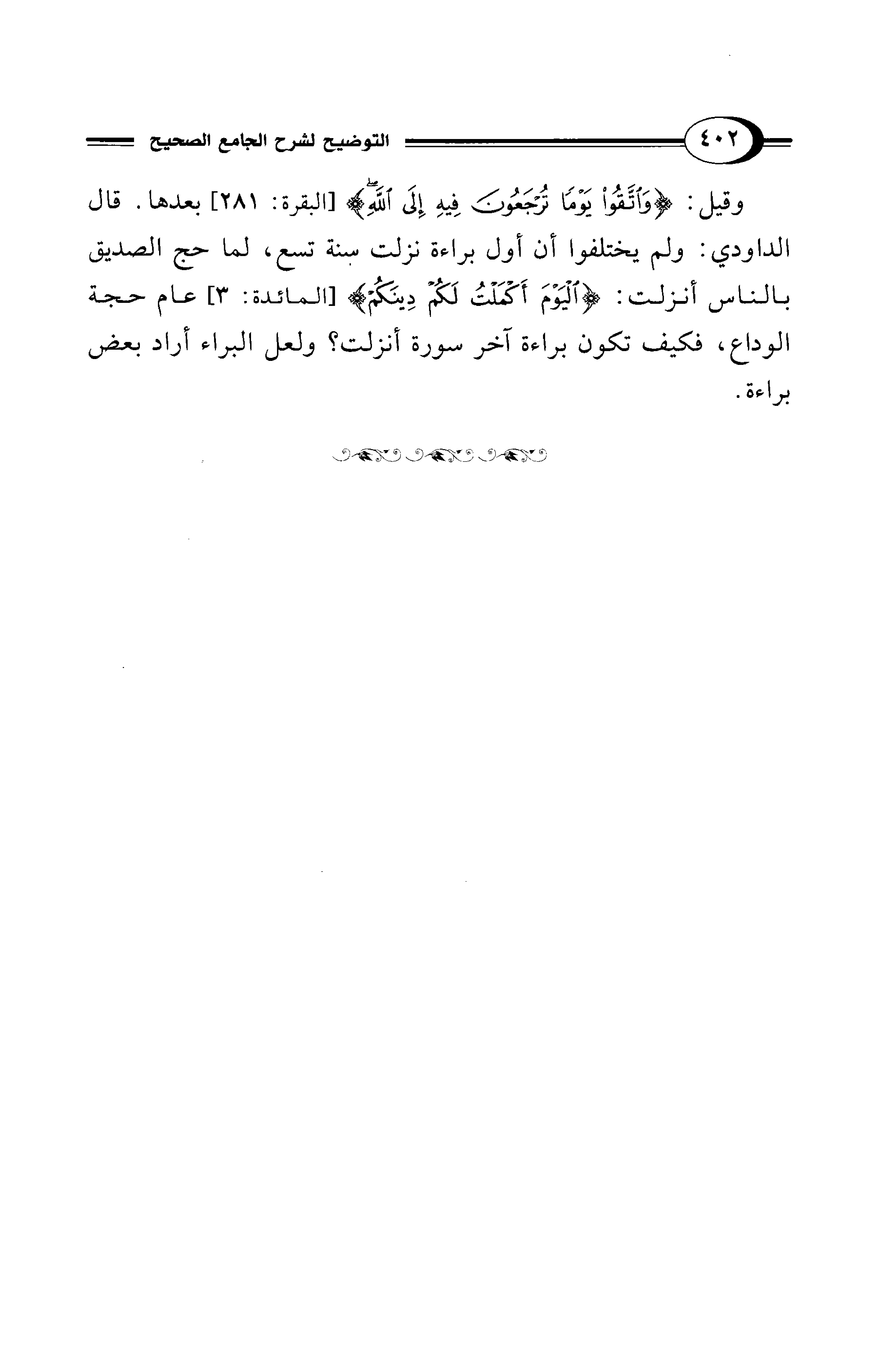 وقيل: {وَاتَّقُوا يَوْمًا تُرْجَعُونَ فِيهِ إِلَى اللهِ} [البقرة: 281] بعدها. قال الداودي: ولم يختلفوا أن أول براءة نزلت سنة تسع، لما حج الصديق بالناس أنزلت: {الْيَوْمَ أَكْمَلْتُ لَكُمْ دِينَكُمْ} [المائدة: 3] عام حجة الوداع، فكيف تكون براءة آخر سورة أنزلت؟ ولعل البراء أراد بعض براءة.