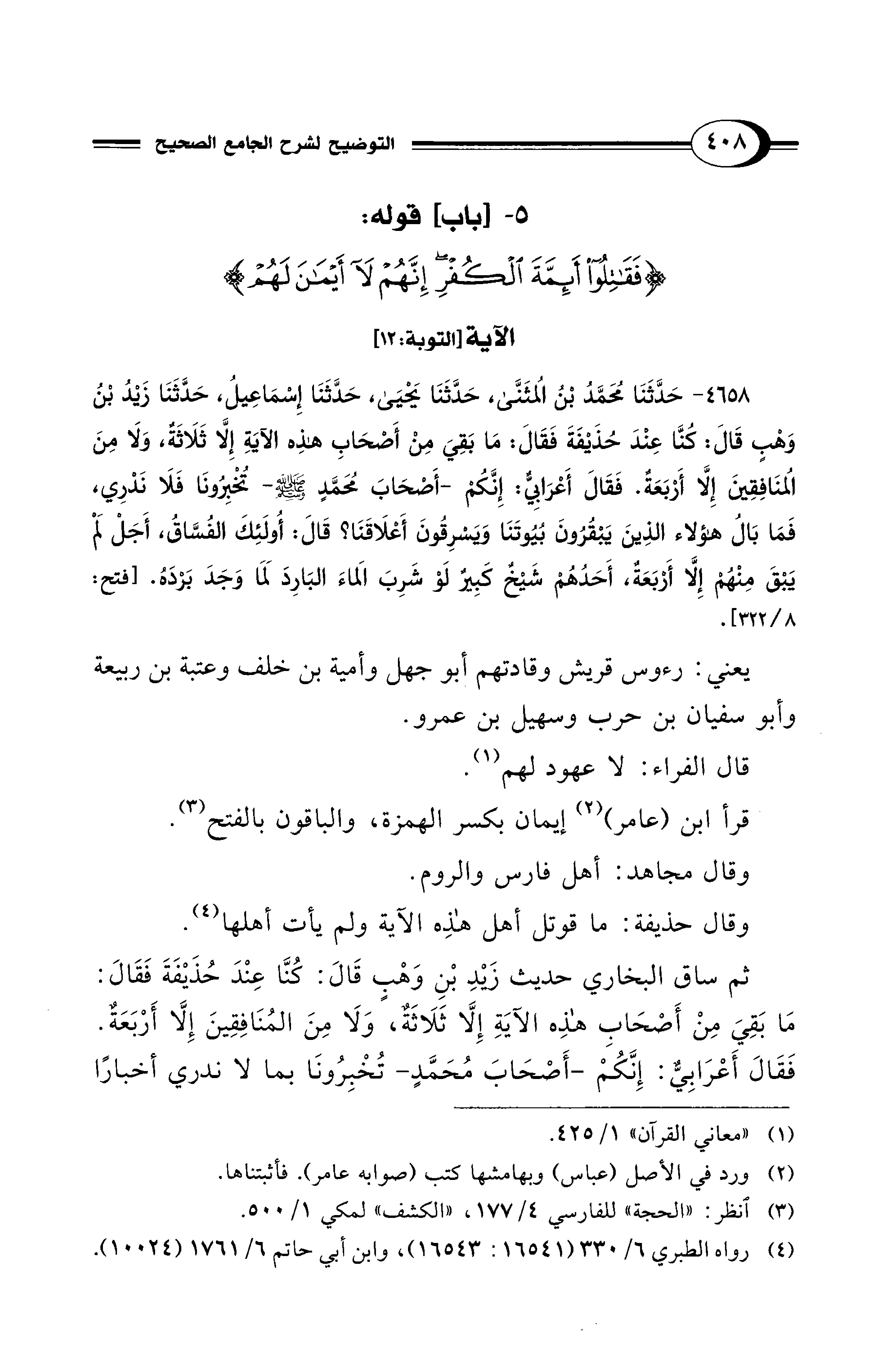5 - [باب] قوله: {فَقَاتِلُوا أَئِمَّةَ الْكُفْرِ إِنَّهُمْ لَا أَيْمَانَ لَهُمْ} الآية [التوبة: 12]