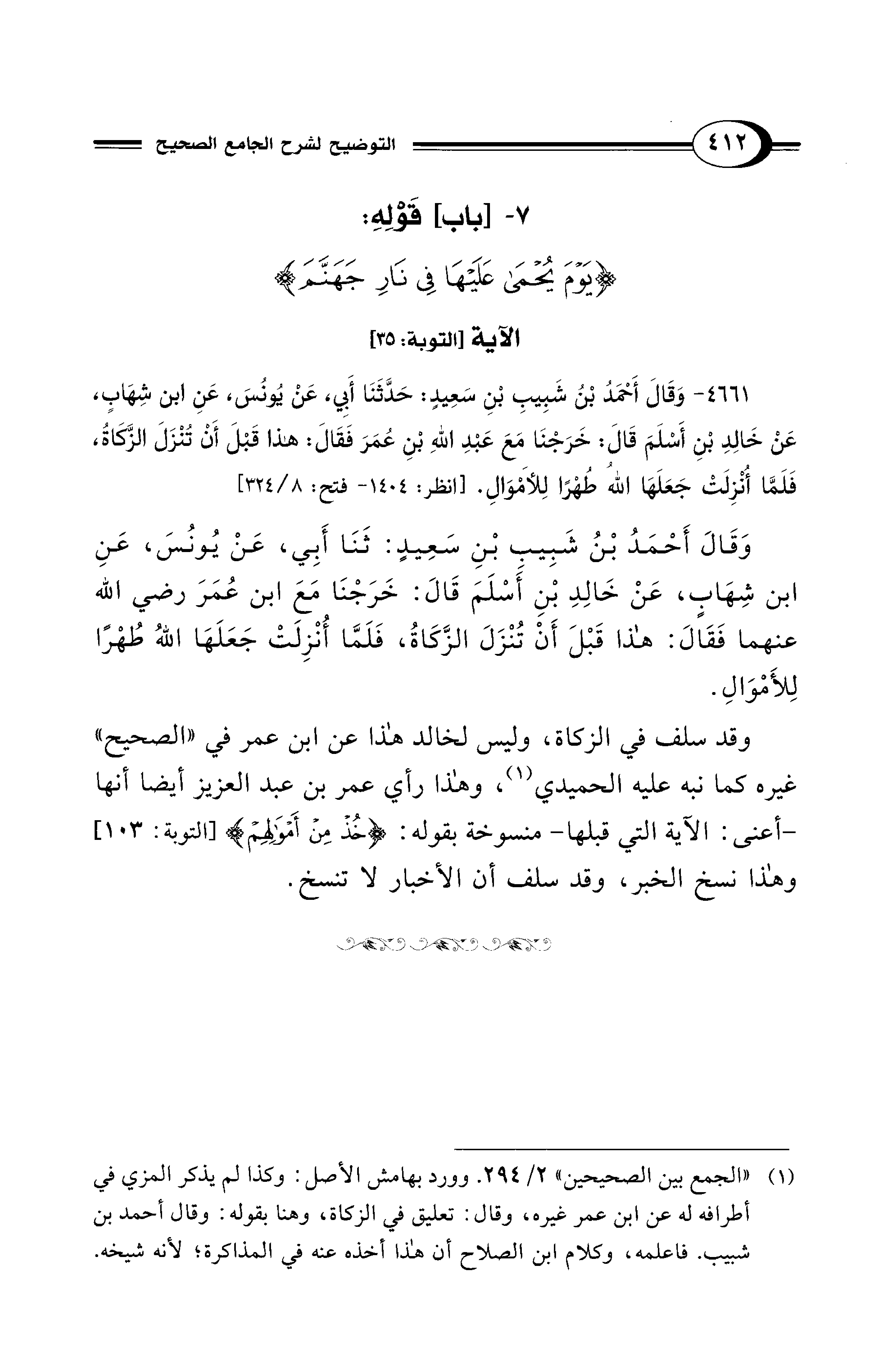 وَقَالَ أَحْمَدُ بْنُ شَبِيبِ بْنِ سَعِيدٍ: ثَنَا أَبِي، عَنْ يُونُسَ، عَنِ ابن شِهَابٍ، عَنْ خَالِدِ بْنِ أً سْلَمَ قَالَ: خَرَجْنَا مَعَ ابن عُمَرَ رضي الله عنهما فَقَالَ: هذا قَبْلَ أَنْ تُنْزَلَ الزَّكَاةُ، فَلَمَّا أُنْزِلَتْ جَعَلَهَا اللهُ طُهْرًا لِلأَمْوَالِ. وقد سلف في الزكاة، وليس لخالد هذا عن ابن عمر في "الصحيح" غيره كما نبه عليه الحميدي (¬1)، وهذا رأي عمر بن عبد العزيز أيضا أنها -أعنى: الآية التي قبلها- منسوخة بقوله: {خُذْ مِنْ أَمْوَالِهِمْ} [التوبة: 103] وهذا نسخ الخبر، وقد سلف أن الأخبار لا تنسخ.