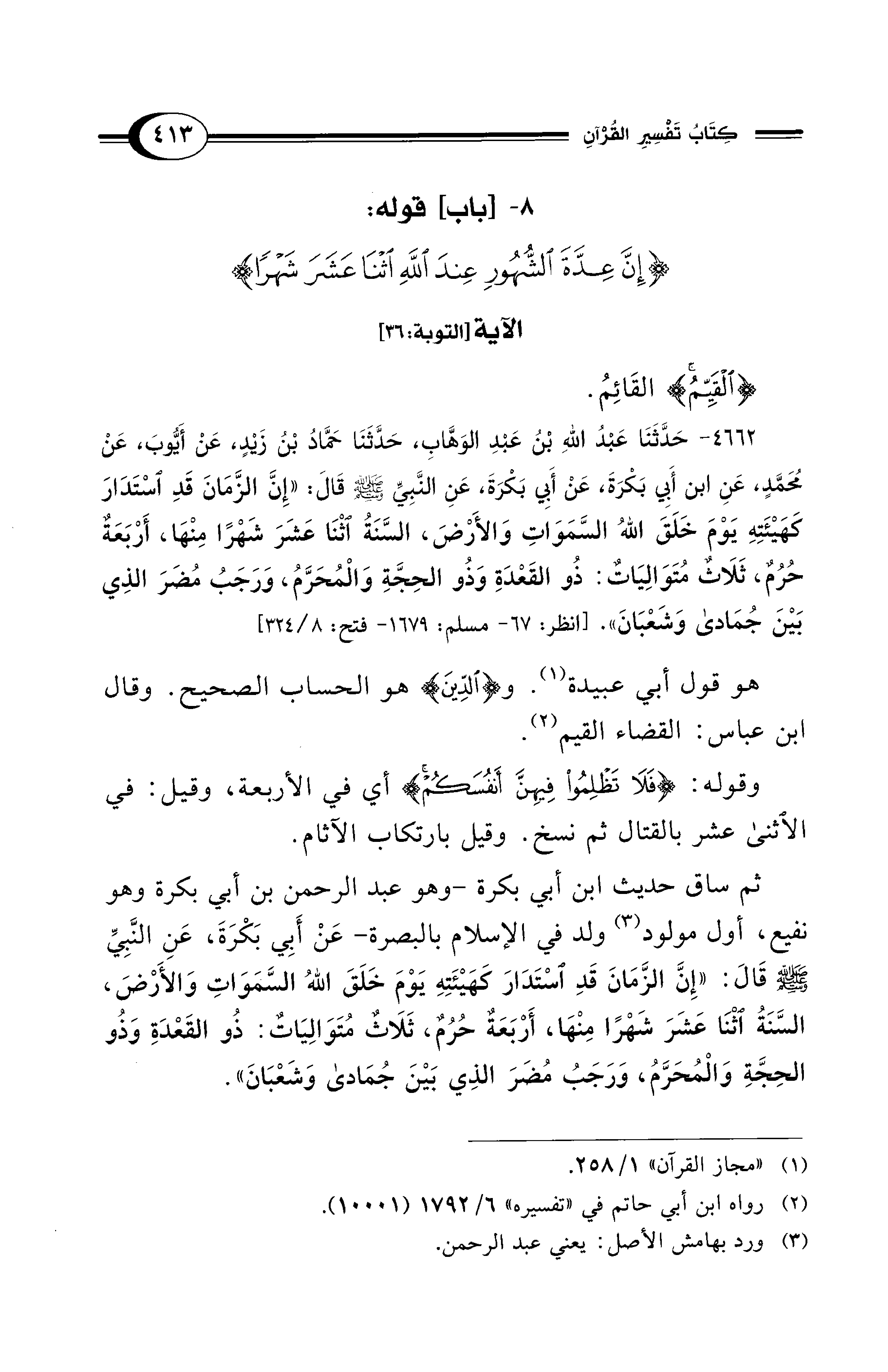 4662 - حَدَّثَنَا عَبْدُ اللهِ بْنُ عَبْدِ الْوَهَّابِ, حَدَّثَنَا حَمَّادُ بْنُ زَيْدٍ, عَنْ أَيُّوبَ, عَنْ مُحَمَّدٍ عَنِ ابْنِ أَبِي بَكْرَةَ, عَنْ أَبِي بَكْرَةَ, عَنِ النَّبِيِّ - صلى الله عليه وسلم - قَالَ: «إِنَّ الزَّمَانَ قَدِ اسْتَدَارَ كَهَيْئَتِهِ يَوْمَ خَلَقَ اللهُ السَّمَوَاتِ وَالأَرْضَ، السَّنَةُ اثْنَا عَشَرَ شَهْرًا مِنْهَا، أَرْبَعَةٌ حُرُمٌ، ثَلاَثٌ مُتَوَالِيَاتٌ: ذُو الْقَعْدَةِ وَذُو الْحِجَّةِ وَالْمُحَرَّمُ, وَرَجَبُ مُضَرَ الَّذِي بَيْنَ جُمَادَى وَشَعْبَانَ». [انظر: 67 - مسلم: 1679 - فتح: 8/ 324]