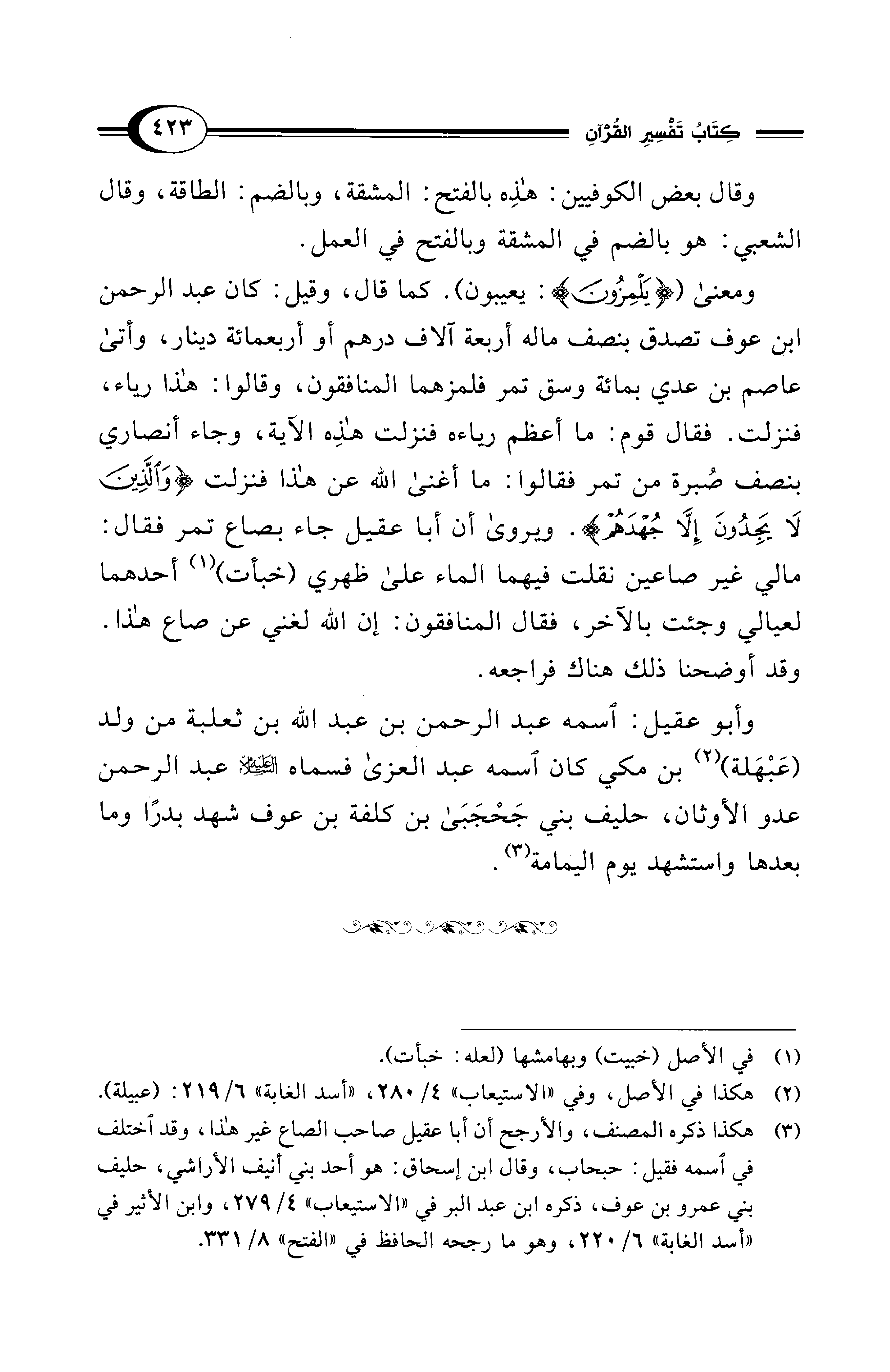 ومعنى ({يَلْمِزُونَ}: يعيبون). كما قال، وقيل: كان عبد الرحمن ابن عوف تصدق بنصف ماله أربعة آلاف درهم أو أربعمائة دينار، وأتى عاصم بن عدي بمائة وسق تمر فلمزهما المنافقون، وقالوا: هذا رياء، فنزلت. فقال قوم: ما أعظم رياءه فنزلت هذِه الآية، وجاء أنصاري بنصف صُبرة من تمر فقالوا: ما أغنى الله عن هذا فنزلت {وَالَّذِينَ لَا يَجِدُونَ إِلَّا جُهْدَهُمْ}. ويروى أن أبا عقيل جاء بصاع تمر فقال: مالي غير صاعين نقلت فيهما الماء على ظهري (خبأت) (¬1) أحدهما لعيالي وجئت بالآخر، فقال المنافقون: إن الله لغني عن صاع هذا. وقد أوضحنا ذلك هناك فراجعه.