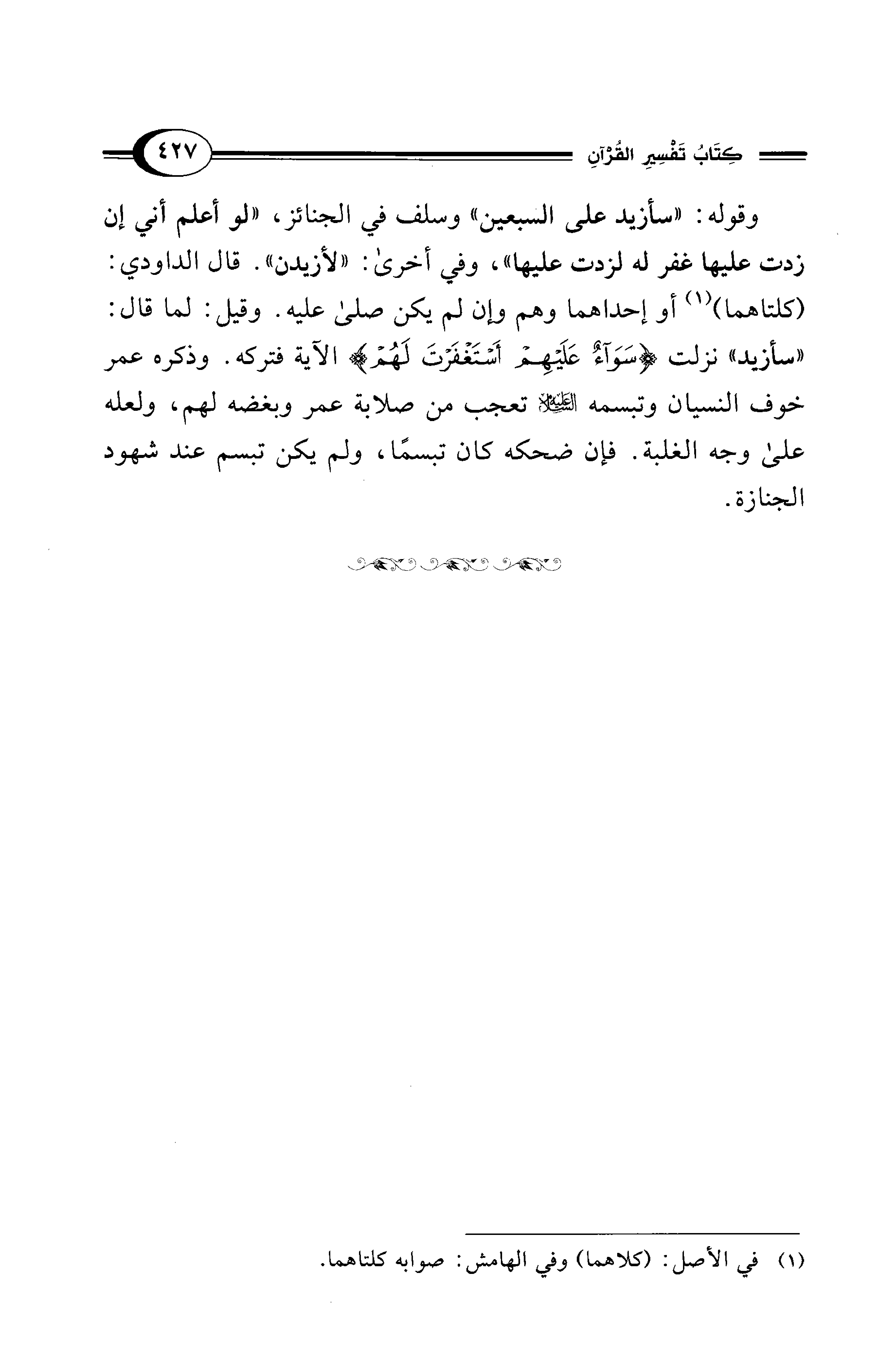 وقوله: "سأزيد على السبعين" وسلف في الجنائز، "لو أعلم أني إن زدت عليها كفر له لزدت عليها"، وفي أخرى: "لأزيدن". قال الداودي: (كلتاهما) (¬1) أو إحداهما وهم وإن لم يكن صلى عليه. وقيل: لما قال: "سأزيد" نزلت {سَوَاءٌ عَلَيْهِمْ أَسْتَغْفَرْتَ لَهُمْ} الآية فتركه. وذكره عمر خوف النسيان وتبسمه - عليه السلام - تعجب من صلابة عمر وبغضه لهم، ولعله على وجه الغلبة. فإن ضحكه كان تبسمًا، ولم يكن تبسم عند شهود الجنازة.