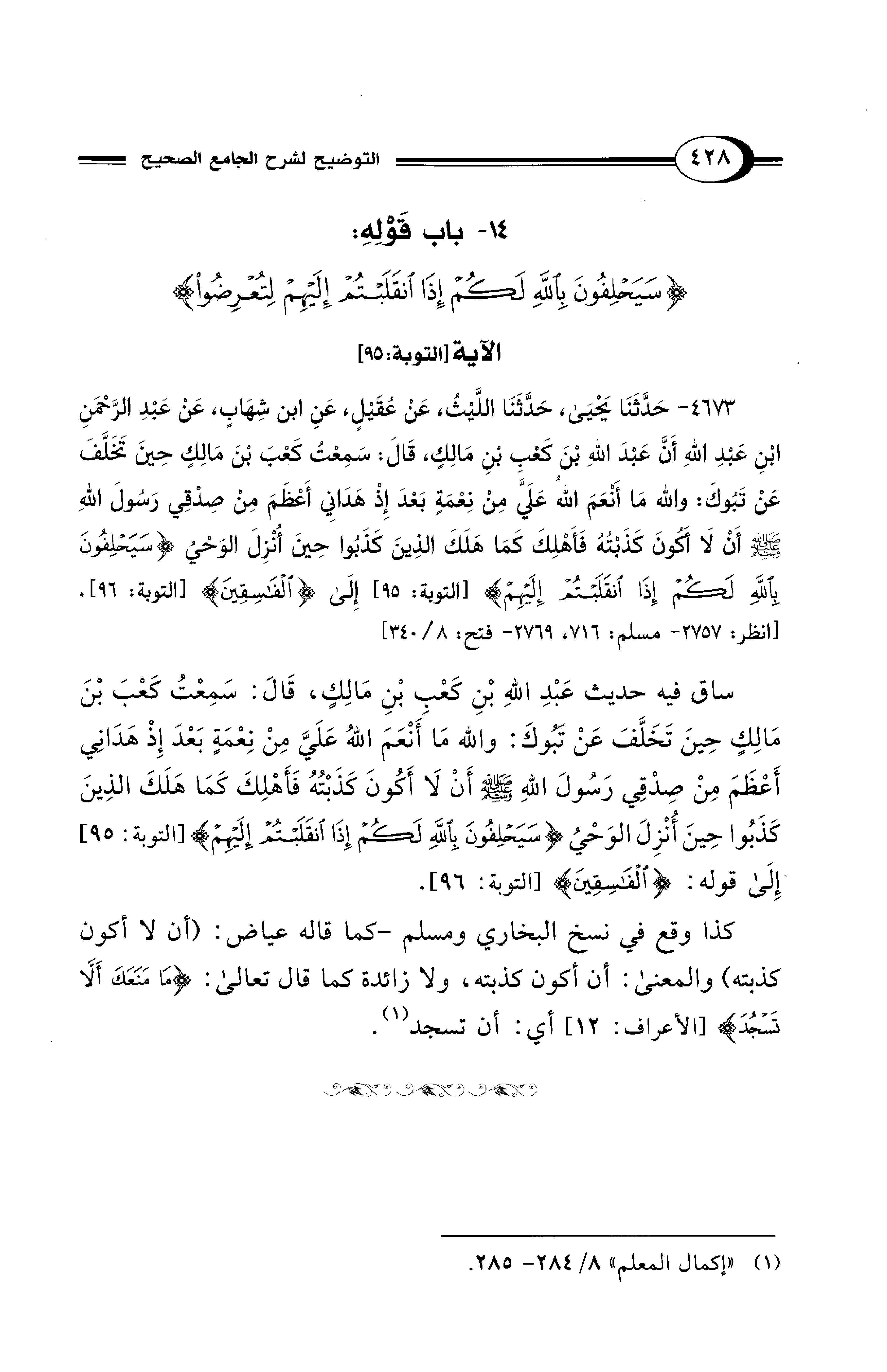 ساق فيه حديث عَبْدِ اللهِ بْنِ كَعْبِ بْنِ مَالِكٍ، قَالَ: سَمِعْتُ كَعْبَ بْنَ مَالِكٍ حِينَ تَخَلَّفَ عَنْ تَبُوكَ: والله مَا أَنْعَمَ اللهُ عَلَيَّ مِنْ نِعْمَةٍ بَعْدَ إِذْ هَدَانِي أَعْظَمَ مِنْ صِدْقِي رَسولَ اللهِ - صلى الله عليه وسلم - أنْ لَا أَكُونَ كَذَبْتُهُ فَأَهْلِكَ كَمَا هَلَكَ الذِينَ كَذَبُوا حِينَ أُنْزِلَ الوَحْيُ {سَيَحْلِفُونَ بِاللهِ لَكُمْ إِذَا انْقَلَبْتُمْ إِلَيْهِمْ لِتُعْرِضُوا} [التوبة: 95] إِلَى قوله: {اْلْفَاسِقِينَ}. [التوبة: 96].