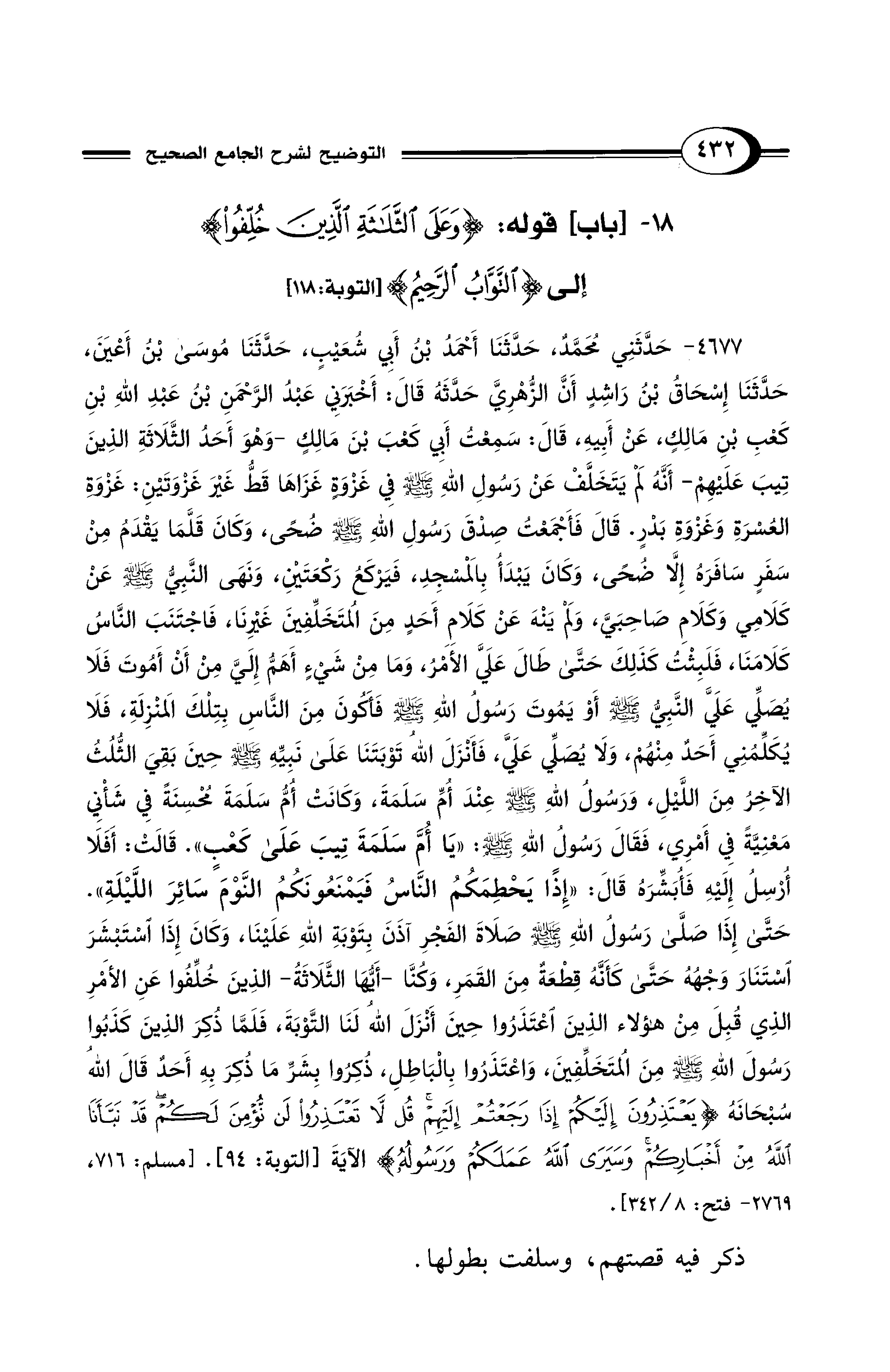 18 - [باب] قوله: {وَعَلَى الثَّلَاثَةِ الَّذِينَ خُلِّفُوا} إلى {التَّوَّابُ الرَّحِيمُ} [التوبة: 118]