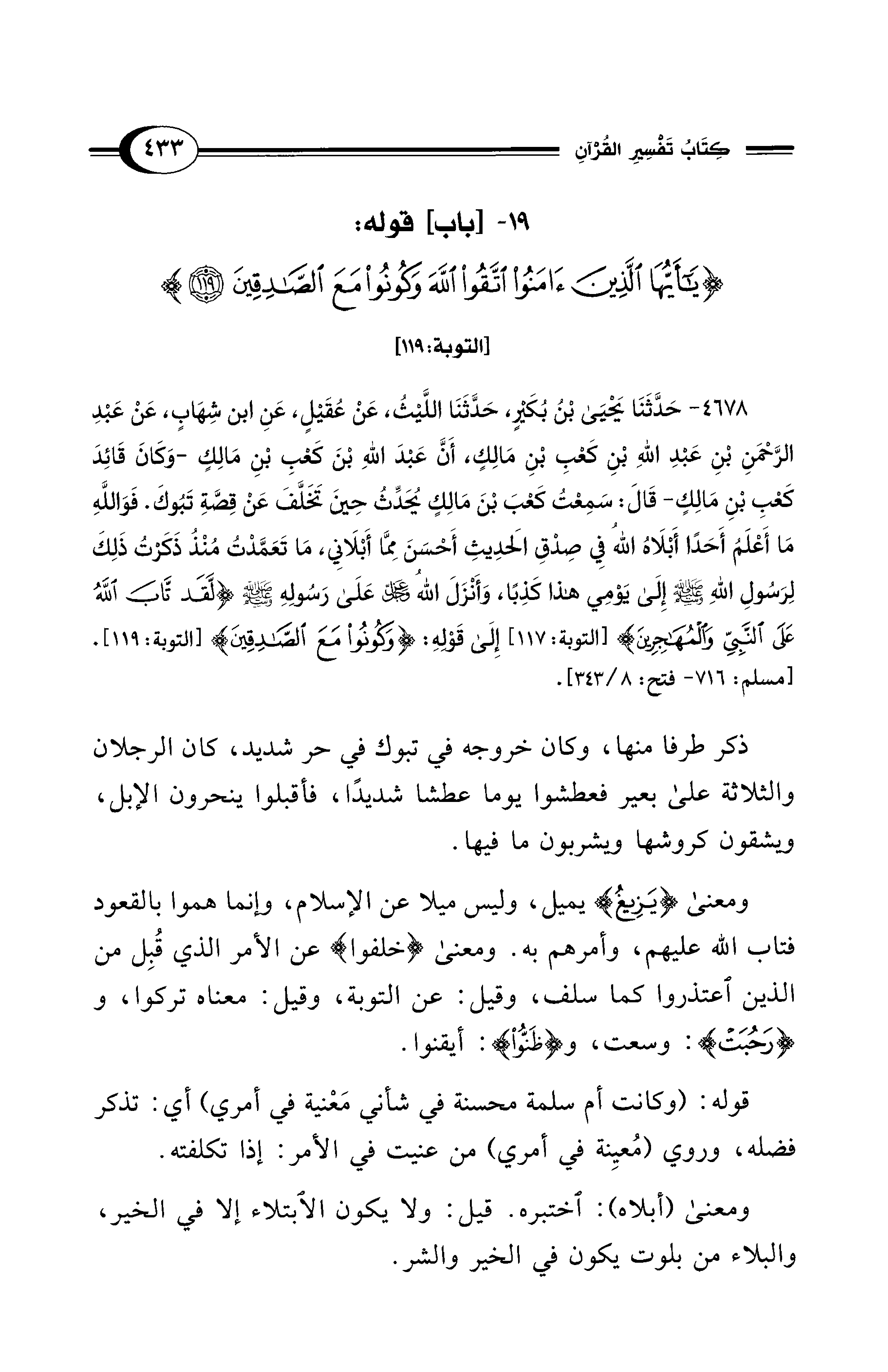 19 - [باب] قوله: {يَا أَيُّهَا الَّذِينَ آمَنُوا اتَّقُوا اللهَ وَكُونُوا مَعَ الصَّادِقِينَ (119)} [التوبة: 119]