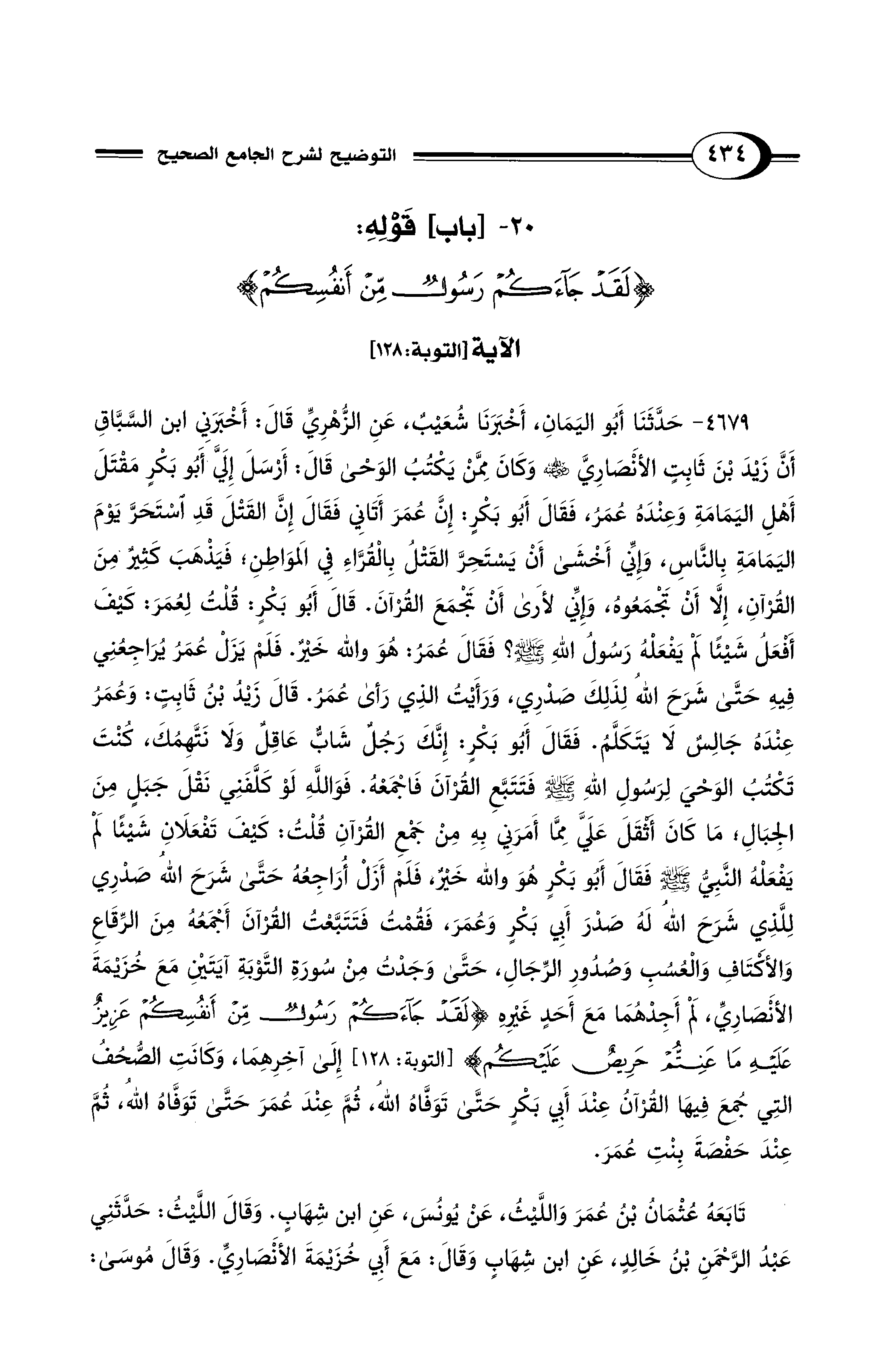 4679 - حَدَّثَنَا أَبُو الْيَمَانِ, أَخْبَرَنَا شُعَيْبٌ, عَنِ الزُّهْرِيِّ, قَالَ: أَخْبَرَنِي ابْنُ السَّبَّاقِ أَنَّ زَيْدَ بْنَ ثَابِتٍ الأَنْصَارِيَّ - رضي الله عنه - وَكَانَ مِمَّنْ يَكْتُبُ الْوَحْيَ قَالَ: أَرْسَلَ إِلَيَّ أَبُو بَكْرٍ مَقْتَلَ أَهْلِ الْيَمَامَةِ وَعِنْدَهُ عُمَرُ، فَقَالَ أَبُو بَكْرٍ: إِنَّ عُمَرَ أَتَانِي فَقَالَ: إِنَّ الْقَتْلَ قَدِ اْسْتَحَرَّ يَوْمَ الْيَمَامَةِ بِالنَّاسِ، وَإِنِّي أَخْشَى أَنْ يَسْتَحِرَّ الْقَتْلُ بِالْقُرَّاءِ فِي الْمَوَاطِنِ؛ فَيَذْهَبَ كَثِيرٌ مِنَ الْقُرْآنِ، إِلاَّ أَنْ تَجْمَعُوهُ، وَإِنِّي لأَرَى أَنْ تَجْمَعَ الْقُرْآنَ. قَالَ أَبُو بَكْرٍ: قُلْتُ لِعُمَرَ: كَيْفَ أَفْعَلُ شَيْئًا لَمْ يَفْعَلْهُ رَسُولُ اللهِ - صلى الله عليه وسلم -؟ فَقَالَ عُمَرُ: هُوَ وَاللهِ خَيْرٌ. فَلَمْ يَزَلْ عُمَرُ يُرَاجِعُنِي فِيهِ حَتَّى شَرَحَ اللهُ لِذَلِكَ صَدْرِي، وَرَأَيْتُ الَّذِي رَأَى عُمَرُ. قَالَ زَيْدُ بْنُ ثَابِتٍ: وَعُمَرُ عِنْدَهُ جَالِسٌ لاَ يَتَكَلَّمُ. فَقَالَ أَبُو بَكْر: إِنَّكَ رَجُلٌ شَابٌّ عَاقِلٌ وَلاَ نَتَّهِمُكَ، كُنْتَ تَكْتُبُ الْوَحْيَ لِرَسُولِ اللهِ - صلى الله عليه وسلم - فَتَتَبَّعِ الْقُرْآنَ فَاجْمَعْهُ. فَوَاللهِ لَوْ كَلَّفَنِي نَقْلَ جَبَلٍ مِنَ الْجِبَالِ مَا كَانَ أَثْقَلَ عَلَيَّ مِمَّا أَمَرَنِي بِهِ مِنْ جَمْعِ الْقُرْآنِ قُلْتُ: كَيْفَ تَفْعَلاَنِ شَيْئًا لَمْ يَفْعَلْهُ النَّبِيُّ - صلى الله عليه وسلم - فَقَالَ أَبُو بَكْرٍ هُوَ وَاللهِ خَيْرٌ، فَلَمْ أَزَلْ أُرَاجِعُهُ حَتَّى شَرَحَ اللهُ صَدْرِي لِلَّذِى شَرَحَ اللهُ لَهُ صَدْرَ أَبِي بَكْرٍ وَعُمَرَ، فَقُمْتُ فَتَتَبَّعْتُ الْقُرْآنَ أَجْمَعُهُ مِنَ الرِّقَاعِ وَالأَكْتَافِ وَالْعُسُبِ وَصُدُورِ الرِّجَالِ، حَتَّى وَجَدْتُ مِنْ سُورَةِ التَّوْبَةِ آيَتَيْنِ مَعَ خُزَيْمَةَ الأَنْصَارِيِّ، لَمْ أَجِدْهُمَا مَعَ أَحَدٍ غَيْرِهِ {لَقَدْ جَاءَكُمْ رَسُولٌ مِنْ أَنْفُسِكُمْ عَزِيزٌ عَلَيْهِ مَا عَنِتُّمْ حَرِيصٌ عَلَيْكُمْ} [التوبة: 128] إِلَى آخِرِهِمَا، وَكَانَتِ الصُّحُفُ الَّتِي جُمِعَ فِيهَا الْقُرْآنُ عِنْدَ أَبِي بَكْرٍ حَتَّى تَوَفَّاهُ اللهُ، ثُمَّ عِنْدَ عُمَرَ حَتَّى تَوَفَّاهُ اللهُ، ثُمَّ عِنْدَ حَفْصَةَ بِنْتِ عُمَرَ.