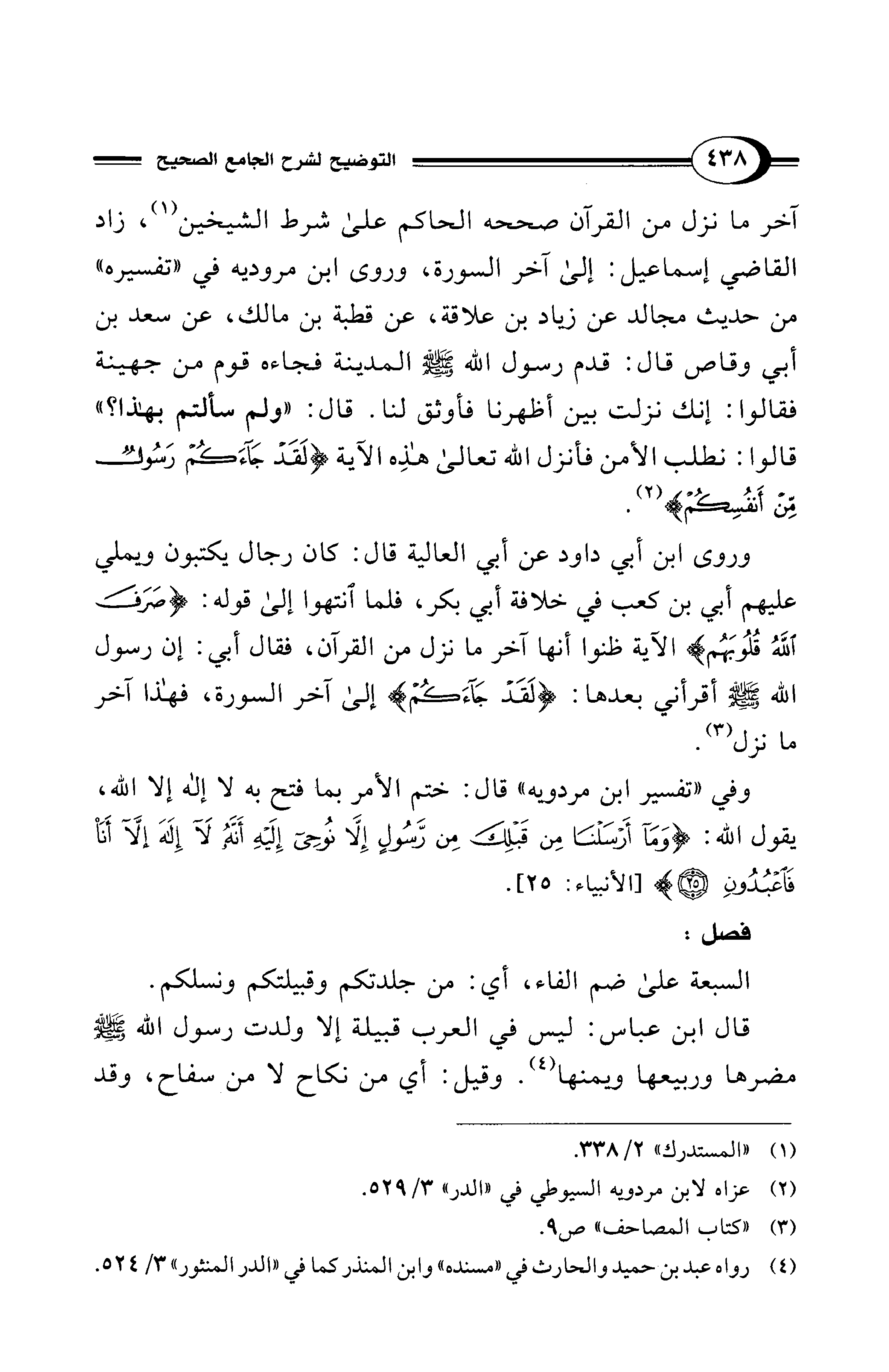وفي "تفسير ابن مردويه " قال: ختم الأمر بما فتح به لا إله إلا الله، يقول الله: {وَمَا أَرْسَلْنَا مِنْ قَبْلِكَ مِنْ رَسُولٍ إِلَّا نُوحِي إِلَيْهِ أَنَّهُ لَا إِلَهَ إِلَّا أَنَا فَاعْبُدُونِ (25)} [الأنبياء: 25].