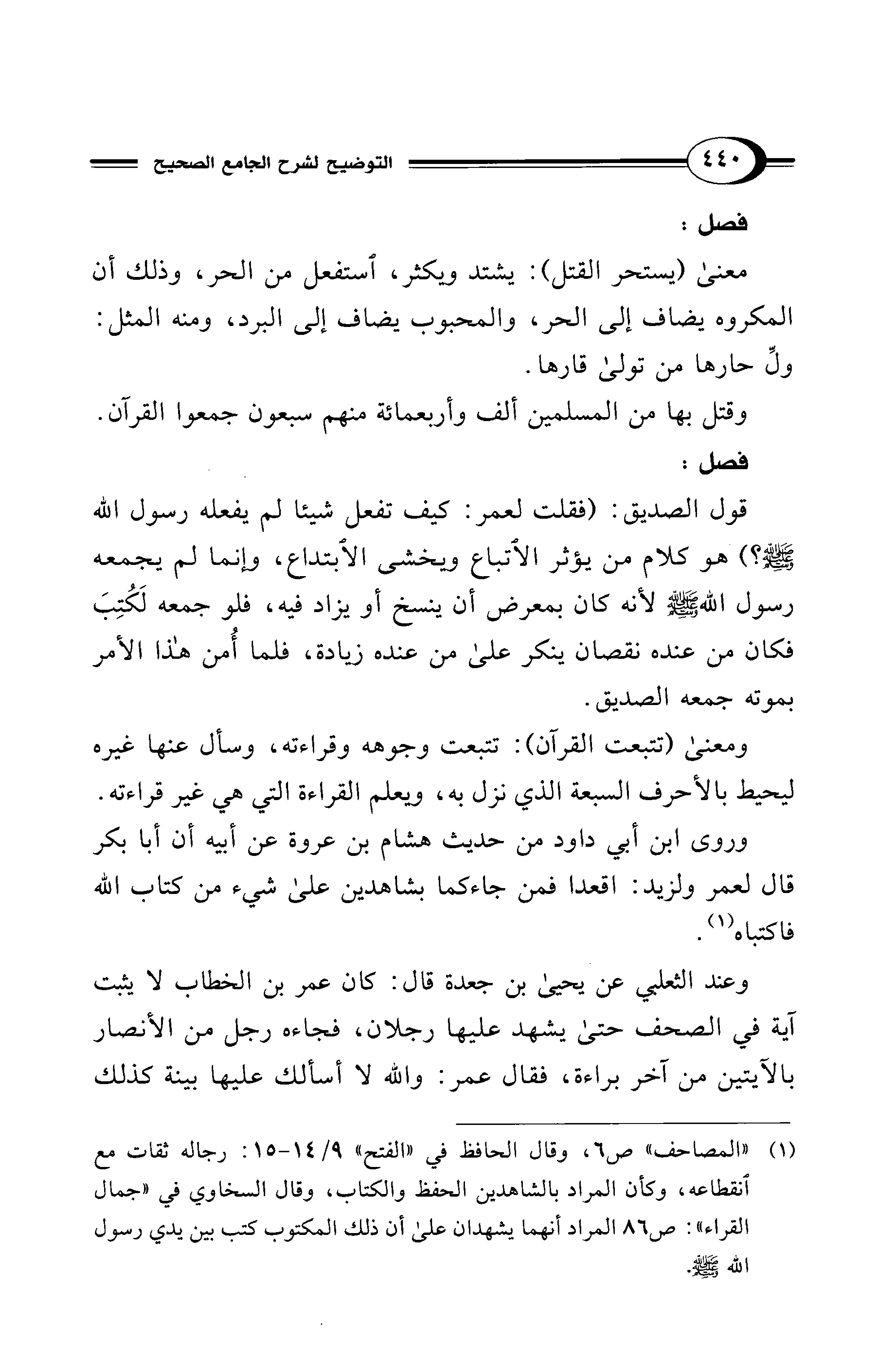 (¬1) "المصاحف" ص 6، وقال الحافظ في "الفتح" 9/ 14 - 15: رجاله ثقات مع انقطاعه، وكأن المراد بالشاهدين الحفظ والكتاب، وقال السخاوي في "جمال القراء": ص 86 المراد أنهما يشهدان على أن ذلك المكتوب كتب بين يدي رسول الله - صلى الله عليه وسلم -.