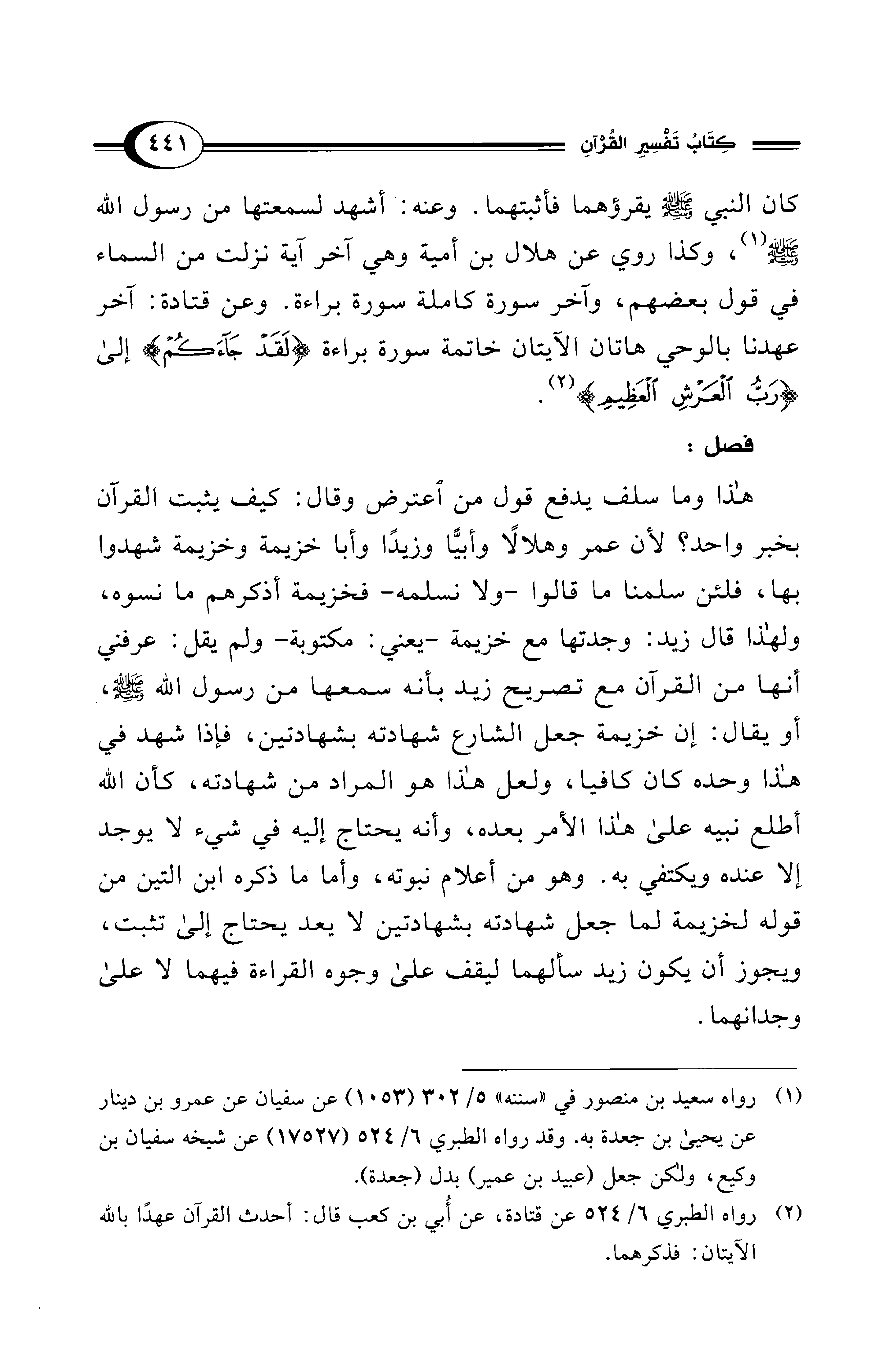 هذا وما سلف يدفع قول من اعترض وقال: كيف يثبت القرآن بخبر واحد؟ لأن عمر وهلالًا وأبيًّا وزيدًا وأبا خزيمة وخزيمة شهدوا بها، فلئن سلمنا ما قالوا -ولا نسلمه- فخزيمة أذكرهم ما نسوه، ولهذا قال زيد: وجدتها مع خزيمة -يعني: مكتوبة- ولم يقل: عرفني أنها من القرآن مع تصريح زيد بأنه سمعها من رسول الله - صلى الله عليه وسلم -، أو يقال: إن خزيمة جعل الشارع شهادته بشهادتين، فإذا شهد في هذا وحده كان كافيا، ولعل هذا هو المراد من شهادته، كأن الله أطلع نبيه على هذا الأمر بعده، وأنه يحتاج إليه في شيء لا يوجد إلا عنده ويكتفي به. وهو من أعلام نبوته، وأما ما ذكره ابن التين من قوله لخزيمة لما جعل شهادته بشهادتين لا يعد يحتاج إلى تثبت، ويجوز أن يكون زيد سألهما ليقف على وجوه القراءة فيهما لا على وجدانهما.