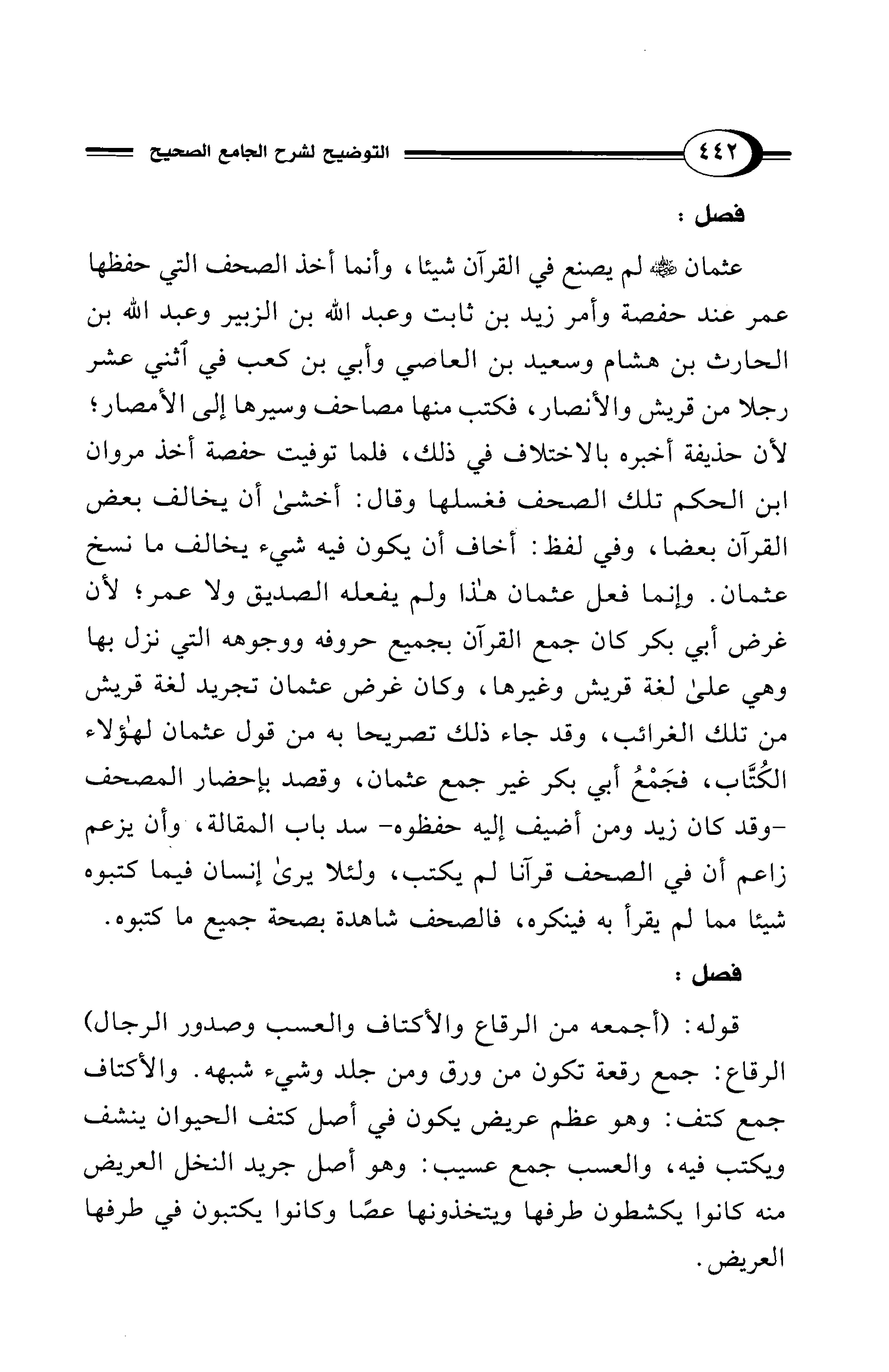 قوله: (أجمعه من الرقاع والأكتاف والعسب وصدور الرجال) الرقاع: جمع رقعة تكون من ورق ومن جلد وشيء شبهه. والأكتاف جمع كتف: وهو عظم عريض يكون في أصل كتف الحيوان ينشف ويكتب فيه، والعسب جمع عسيب: وهو أصل جريد النخل العريض منه كانوا يكشطون طرفها ويتخذونها عصًا وكانوا يكتبون في طرفها العريض.