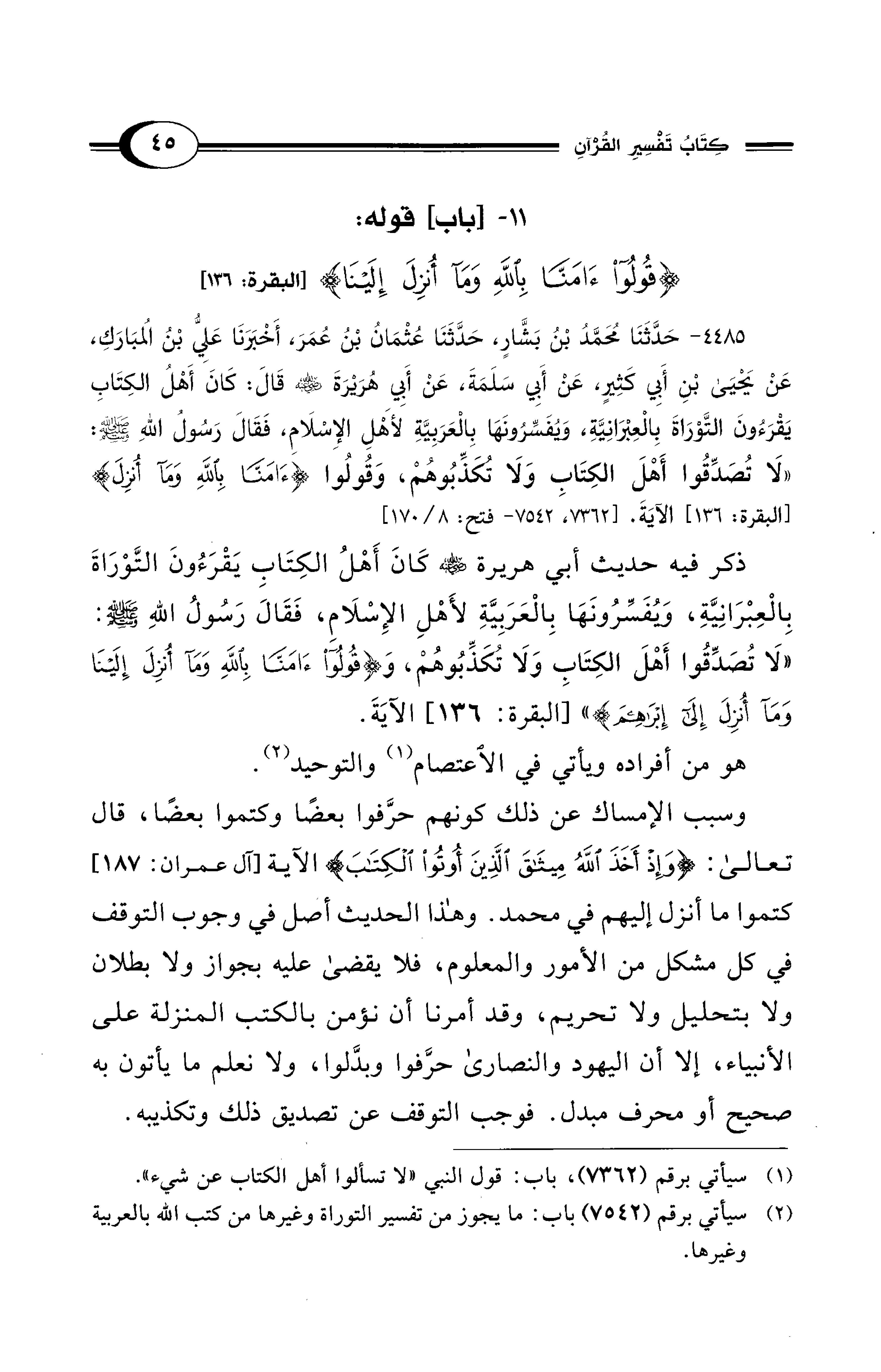 (¬2) سيأتي برقم (7542) باب: ما يجوز من تفسير التوراة وغيرها من كتب الله بالعربية وغيرها.