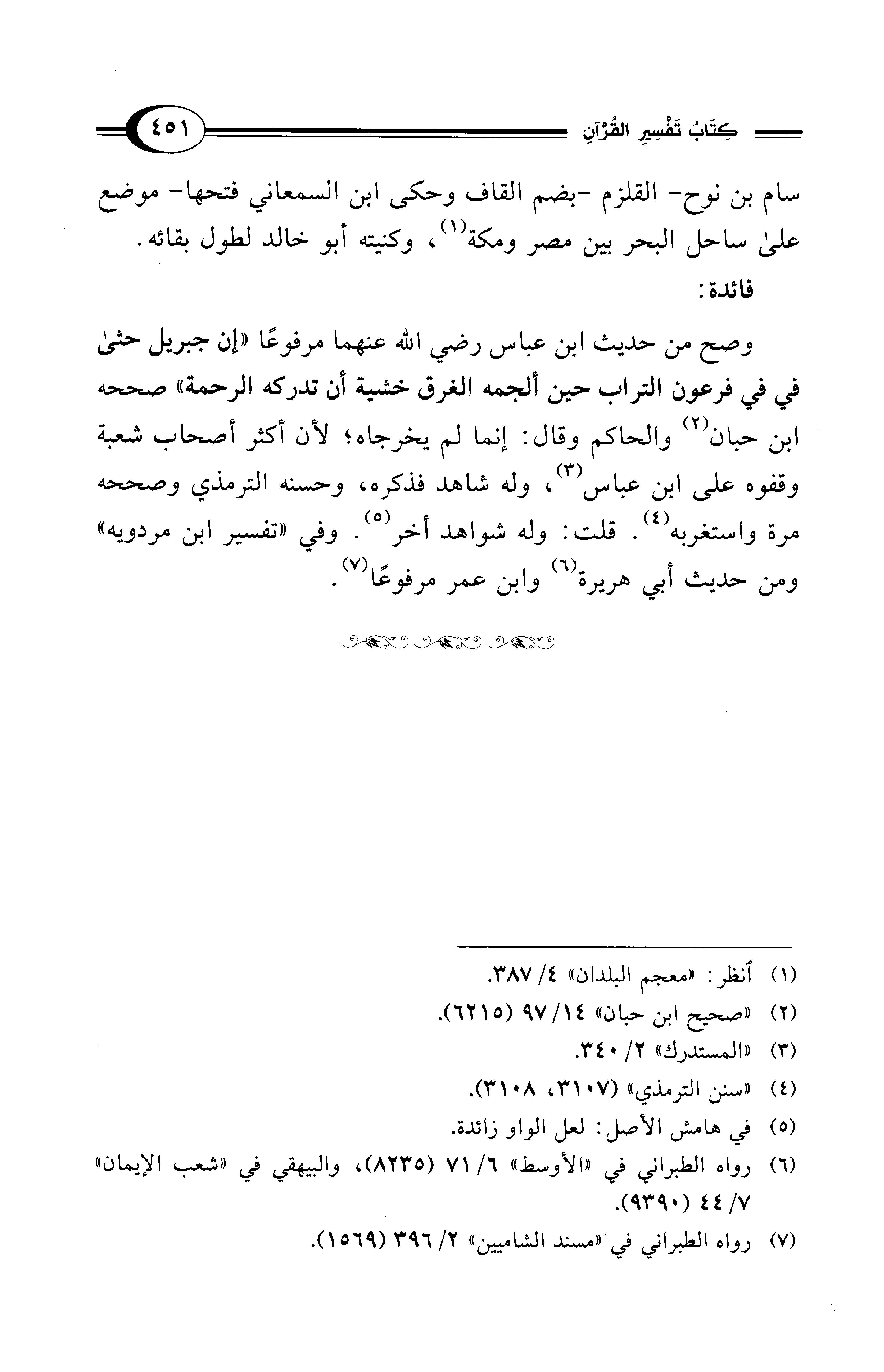 وصح من حديث ابن عباس رضي الله عنهما مرفوعًا "إن جبريل حثى فى في فرعون التراب حين ألجمه الغرق خشية أن تدركه الرحمة" صححه ابن حبان (¬2) والحاكم وقال: إنما لم يخرجاه؛ لأن أكثر أصحاب شعبة وقفوه على ابن عباس (¬3)، وله شاهد فذكره، وحسنه الترمذي وصححه مرة واستغربه (¬4). قلت: وله شواهد أخر (¬5). وفي "تفسير ابن مردويه" ومن حديث أبي هريرة (¬6) وابن عمر مرفوعًا (¬7).
