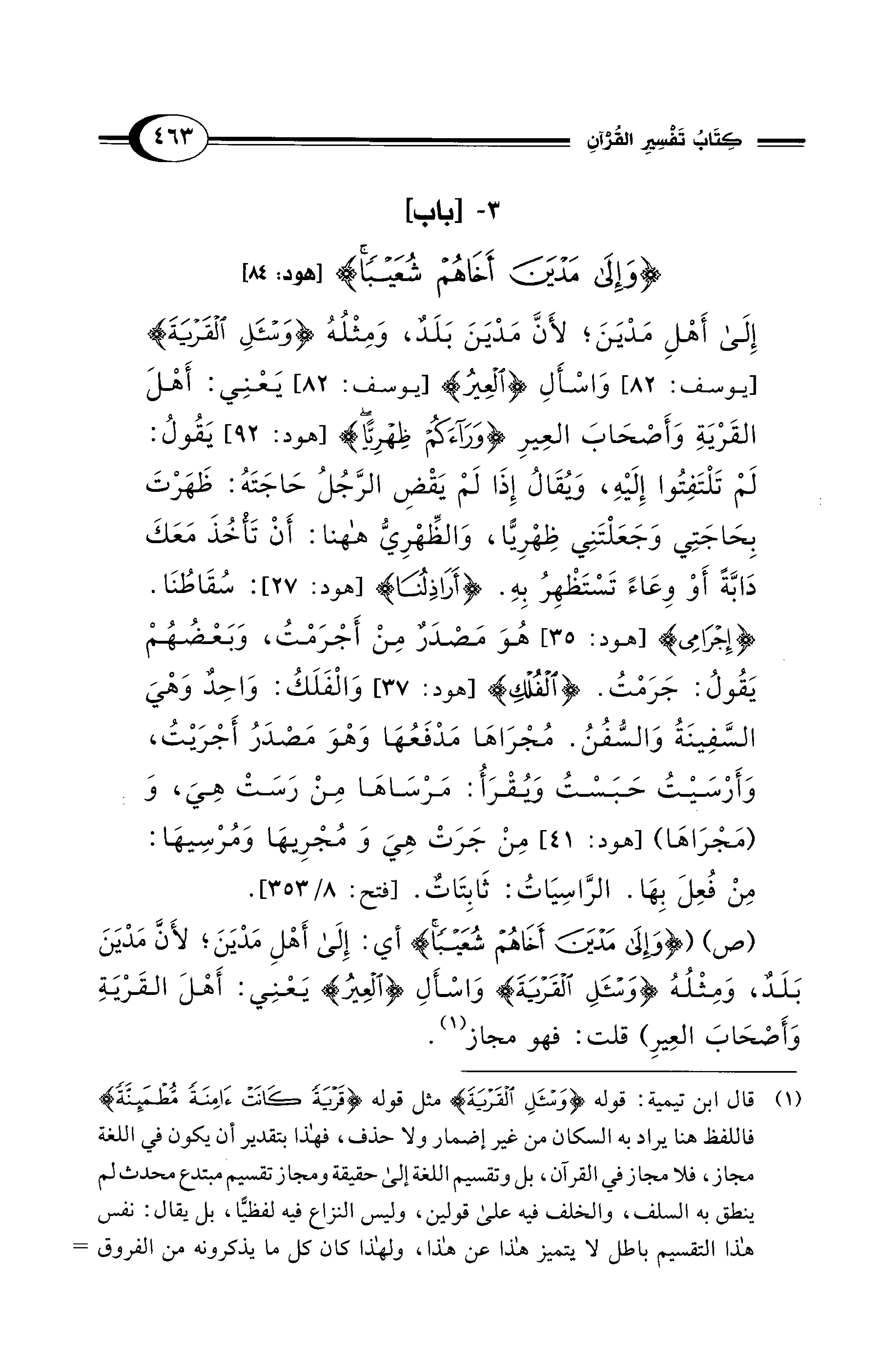 (ص) ({وَإِلَى مَدْيَنَ أَخَاهُمْ شُعَيْبًا} أي: إلى أَهْلِ مَدْيَنَ؛ لأَنَّ مَدْيَنَ بَلَدٌ، وَمِثْلُهُ {وَاسْأَلِ الْقَرْيَةَ} وَاسْأَلِ {الْعِيرَ} يَعْنِي: أَهْلَ القَرْيَةِ وَأَصْحَابَ العِيرِ) قلت: فهو مجاز (¬1).