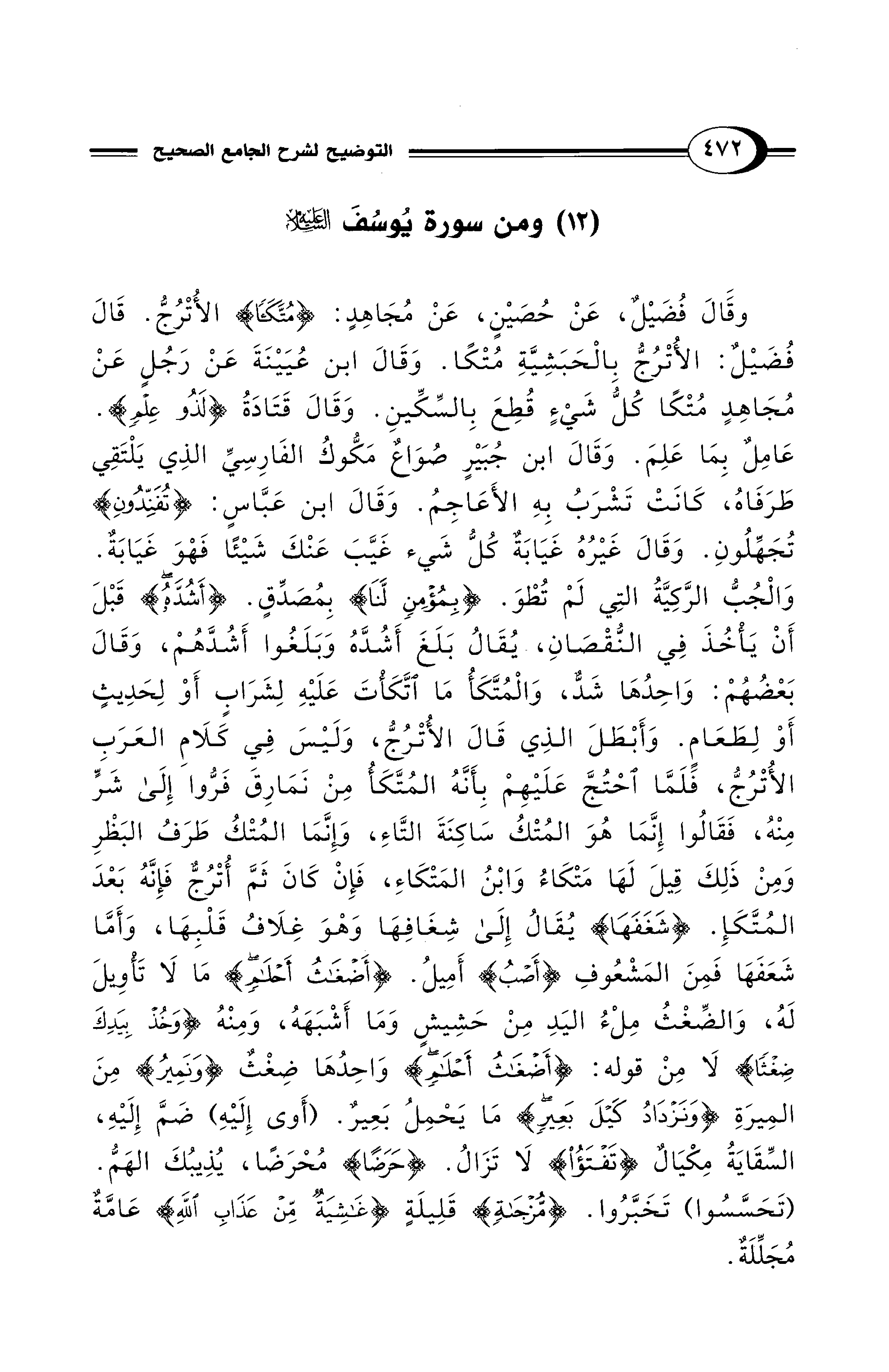 وقًالَ فُضَيْلٌ، عَنْ حُصيْنٍ، عَنْ مُجَاهِدٍ: {مُتَّكَأً} الأُتْرُجُّ. قَالَ فُضَيْلٌ: الأُتْرُجُّ بالْحَبَشِيَّةِ مُتْكًا. وَقَالَ ابن عُيَيْنَةَ عَنْ رَجُلٍ عَنْ مُجَاهِدٍ مُتْكًا كُلُّ شَيْءٍ قُطِعَ بِالسِّكِّينِ. وَقَالَ قَتَادَةُ {لَذُو عِلْمٍ}. عَامِلٌ بِمَا عَلِمَ. وَقَالَ ابن جُبَيْرٍ صُوَاعٌ مَكُّوكُ الفَارِسِيِّ الذِي يَلْتَقِي طَرَفَاهُ، كَانَتْ تَشْرَبُ بِهِ الأَعَاجِمُ. وَقَالَ ابن عَبَّاسٍ: {تُفَنِّدُونِ} تُجَهِّلُونِ. وَقَالَ غَيْرُهُ غَيَابَةٌ كُلُّ شَيء غَيَّبَ عَنْكَ شَيْئًا فَهْوَ غَيَابَةٌ. وَالْجُبُّ الرَّكِيَّةُ التِي لَمْ تُطْوَ. {بِمُؤْمِنٍ لَنَا} بِمُصَدِّقٍ. {أَشُدَّهُ} قَبْلَ أَنْ يَأْخُذَ فِي النُّقْصَانِ، يُقَالُ بَلَغَ أَشُدَّهُ وَبَلَغُوا أَشُدَّهُمْ، وَقَالَ بَعْضُهُمْ: وَاحِدُهَا شَدٌّ، وَالْمُتَّكَأُ مَا اتَّكَأْتَ عَلَيْهِ لِشَرَابٍ أَوْ لِحَدِيثٍ أَوْ لِطَعَامٍ. وَأَبْطَلَ الذِي قَالَ الأُتْرُجُّ، وَلَيْسَ فِي كَلَامِ العَرَبِ الأُتْرُجُّ، فلَمَّا احْتُجَّ عَلَيْهِمْ بِأَنَّهُ المُتَّكَأُ مِنْ نَمَارِقَ فَرُّوا إلى شَرٍّ مِنْهُ، فَقَالُوا إِنَّمَا هُوَ المُتْكُ سَاكِنَةَ التَّاءِ، وَإِنَّمَا المُتْكُ طَرَفُ البَظْرِ وَمِنْ ذَلِكَ قِيلَ لَهَا مَتْكَاءُ وَابْنُ المَتْكَاءِ، فَإِنْ كَانَ ثَمَّ أُتْرُجٌّ فَإِنَّهُ بَعْدَ المُتَّكَإِ. {شَغَفَهَا} يُقَالُ إِلَى شِغَافِهَا وَهْوَ غِلَافُ قَلْبِهَا، وَأَمَّا شَعَفَهَا فَمِنَ المَشْعُوفِ {أَصْبُ} أَمِيلُ. {أَضْغَاثُ أَحْلَام} مَا لَا تَأْوِيلَ لَهُ، وَالضِّغْثُ مِلْءُ اليَدِ مِنْ حَشِيشٍ وَمَا أَشْبَهَهُ، وَمِنْهُ {وَخُذْ بِيَدِكَ ضِغْثًا} لَا مِنْ قوله: {أَضْغَاثُ أَحْلَامٍ} وَاحِدُهَا ضِغْثٌ {وَنَمِيرُ} مِنَ المِيرَةِ {وَنَزْدَادُ كَيْلَ بَعِيرٍ} مَا يَحْمِلُ بَعِيرٌ. (أَوى إِلَيْهِ) ضَمَّ إِلَيْهِ، السِّقَايَةُ مِكْيَالٌ {تَفْتَؤُا} لَا تَزَالُ. {حَرَضًا} مُحْرَضًا، يُذِيبُكَ الهَمُّ. (تَحَسَّسُوا) تَخَبَّرُوا. {مُزْجَاةٍ} قَلِيلَةٍ {غَاشِيَةٌ مِنْ عَذَابِ اللهِ} عَامَّةٌ مُجَلِّلَةٌ.
