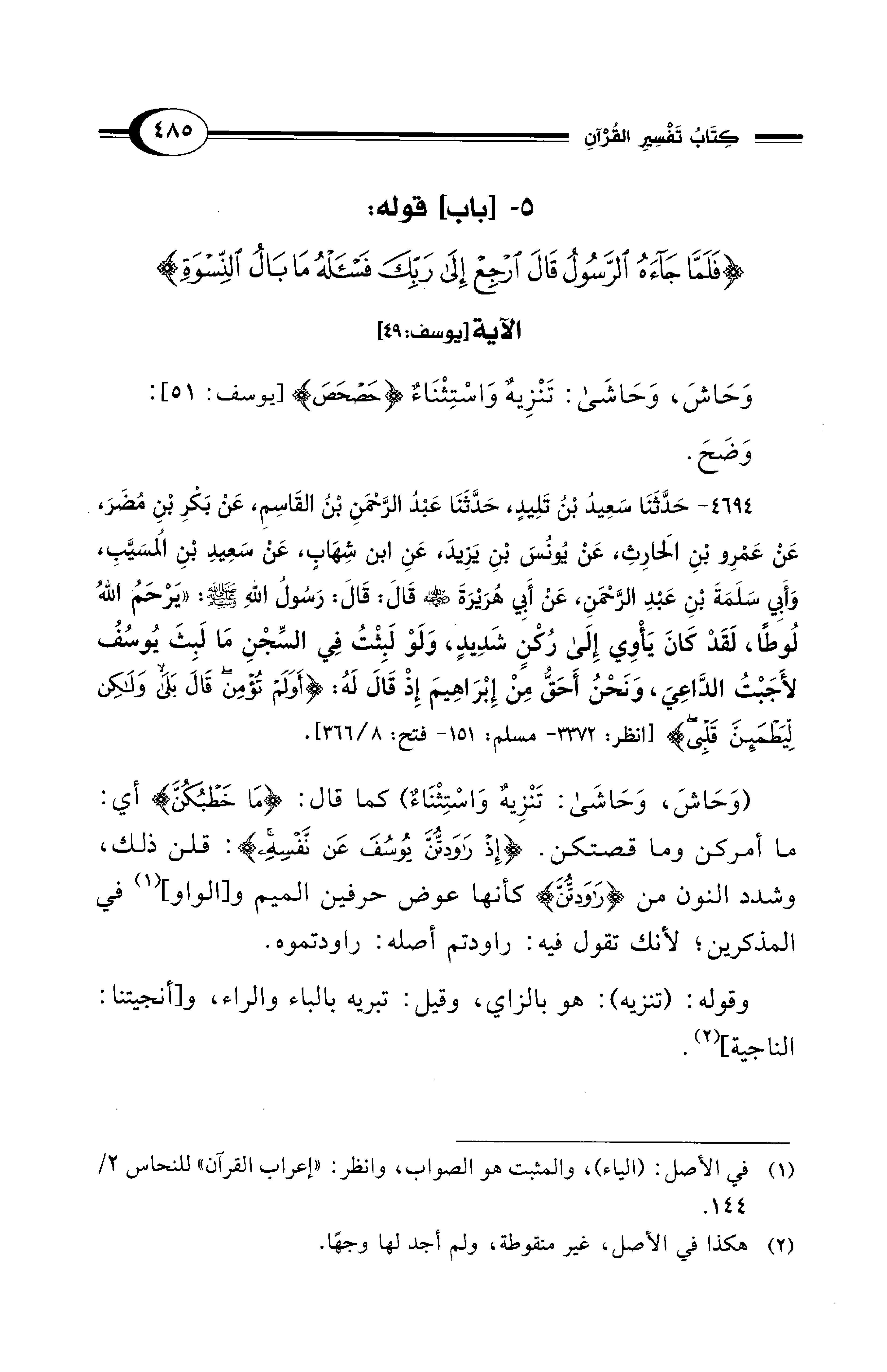 5 - [باب] قوله: {فَلَمَّا جَاءَهُ الرَّسُولُ قَالَ ارْجِعْ إِلَى رَبِّكَ فَاسْأَلْهُ مَا بَالُ النِّسْوَةِ} الآية [يوسف: 49]
