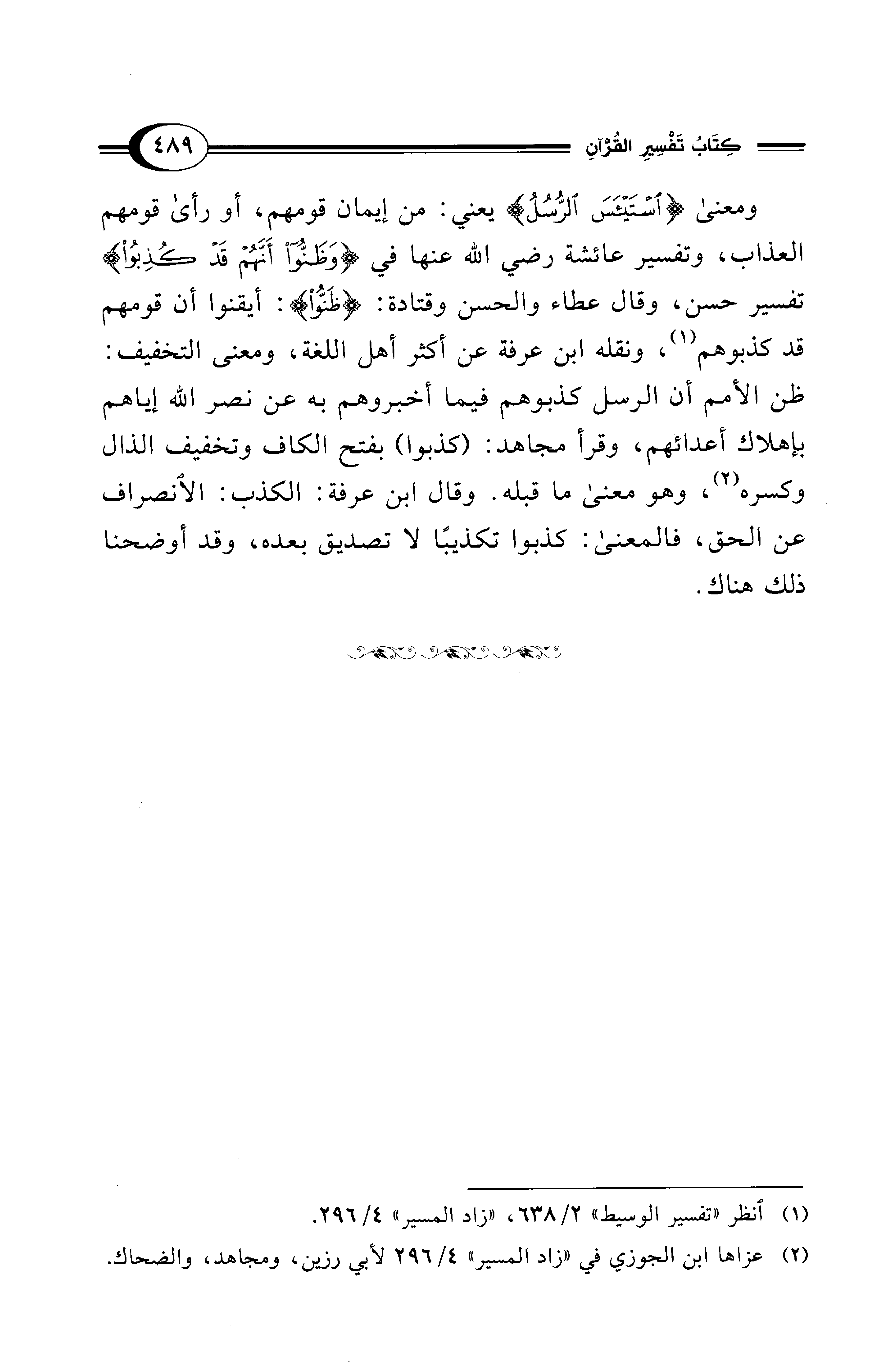 ومعنى {اسْتَيْأَسَ الرُّسُلُ} يعني: من إيمان قومهم، أو رأى قومهم العذاب، وتفسير عائشة رضي الله عنها في {وَظَنُّوا أَنَّهُمْ قَدْ كُذِبُوا} تفسير حسن، وقال عطاء والحسن وقتادة: {ظَنُّوا}: أيقنوا أن قومهم قد كذبوهم (¬1)، ونقله ابن عرفة عن أكثر أهل اللغة، ومعنى التخفيف: ظن الأمم أن الرسل كذبوهم فيما أخبروهم به عن نصر الله إياهم بإهلاك أعدائهم، وقرأ مجاهد: (كذبوا) بفتح الكاف وتخفيف الذال وكسره (¬2)، وهو معنى ما قبله. وقال ابن عرفة: الكذب: الانصراف عن الحق، فالمعنى: كذبوا تكذيبًا لا تصديق بعده، وقد أوضحنا ذلك هناك.