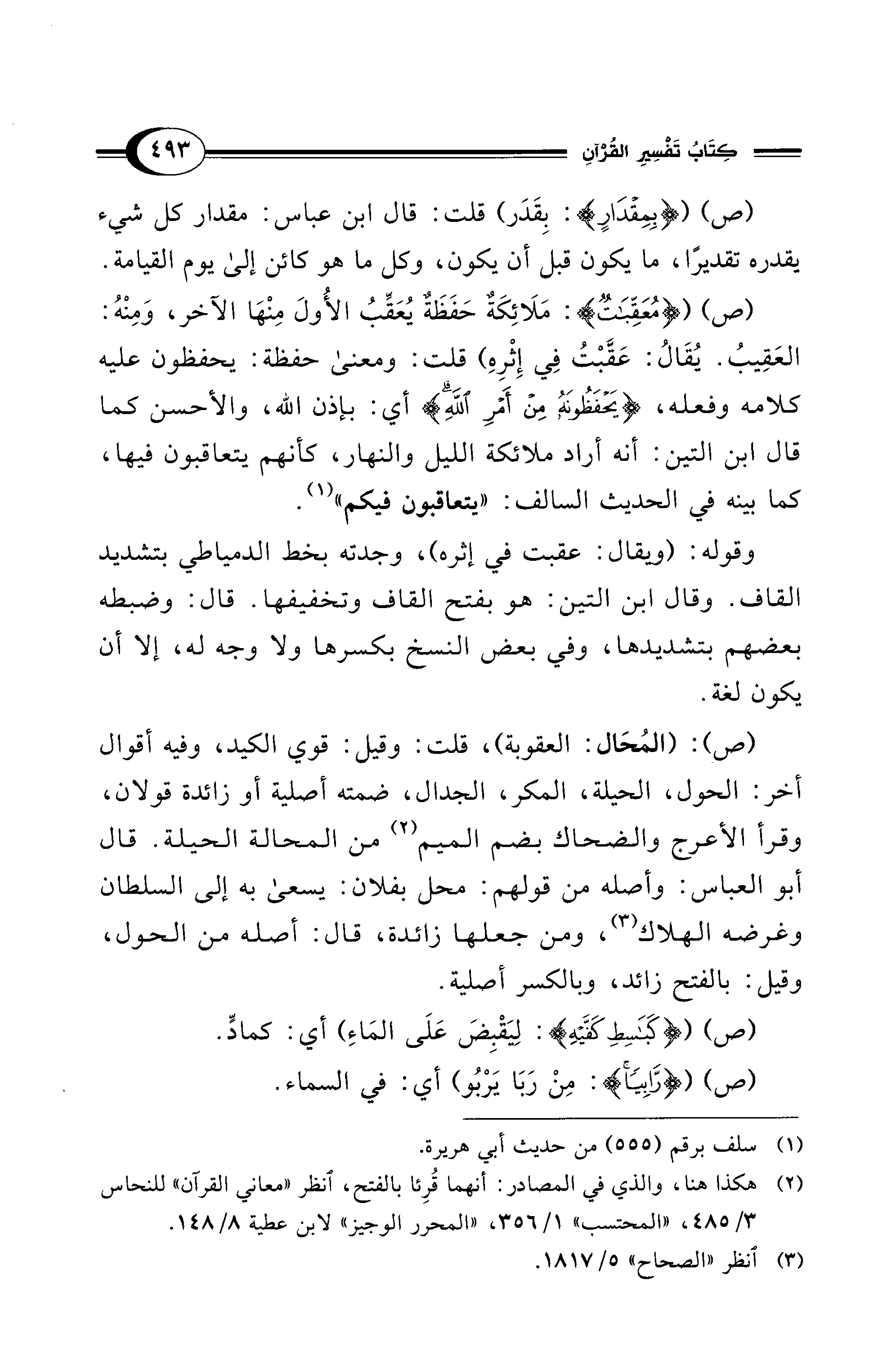 (ص) ({مُعَقِّبَاتٌ}: مَلَائِكَةٌ حَفَظَة يُعَقِّبُ الأُولَ مِنْهَا الآخر، وَمِنْهُ: العَقِيبُ. يُقَالُ: عَقَّبْتُ فِي إِثْرِهِ) قلت: ومعنى حفظة: يحفظون عليه كلامه وفعله، {يَحْفَظُونَهُ مِنْ أَمْرِ اللهِ} أي: بإذن الله، والأحسن كما قال ابن التين: أنه أراد ملائكة الليل والنهار، كأنهم يتعاقبون فيها، كما بينه في الحديث السالف: "يتعاقبون فيكم" (¬1).
