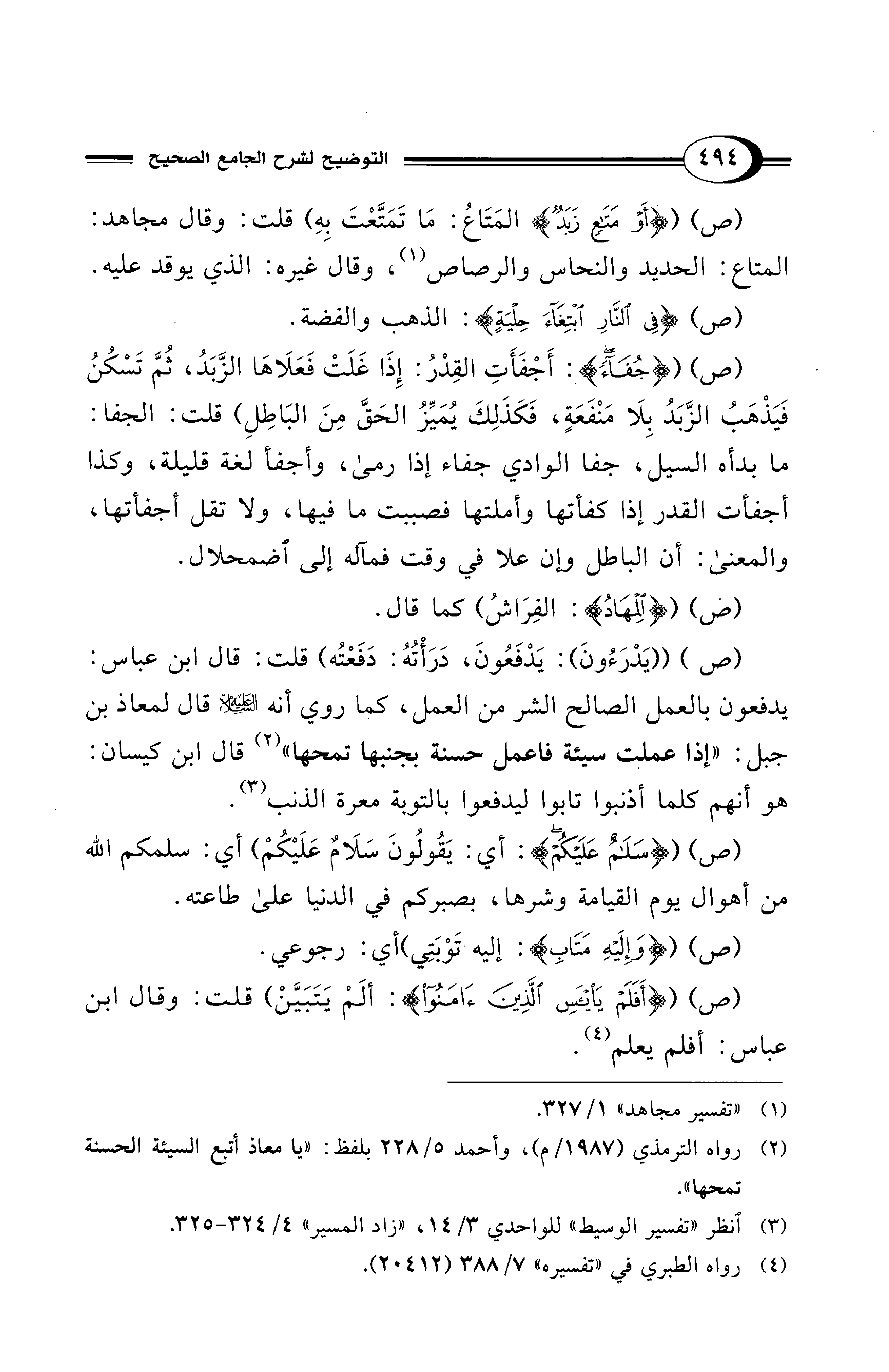 (ص) ({أَوْ مَتَاعٍ زَبَدٌ} المَتَاعُ: مَا تَمَتَّعْتَ بِهِ) قلت: وقال مجاهد: المتاع: الحديد والنحاس والرصاص (¬1)، وقال غيره: الذي يوقد عليه.