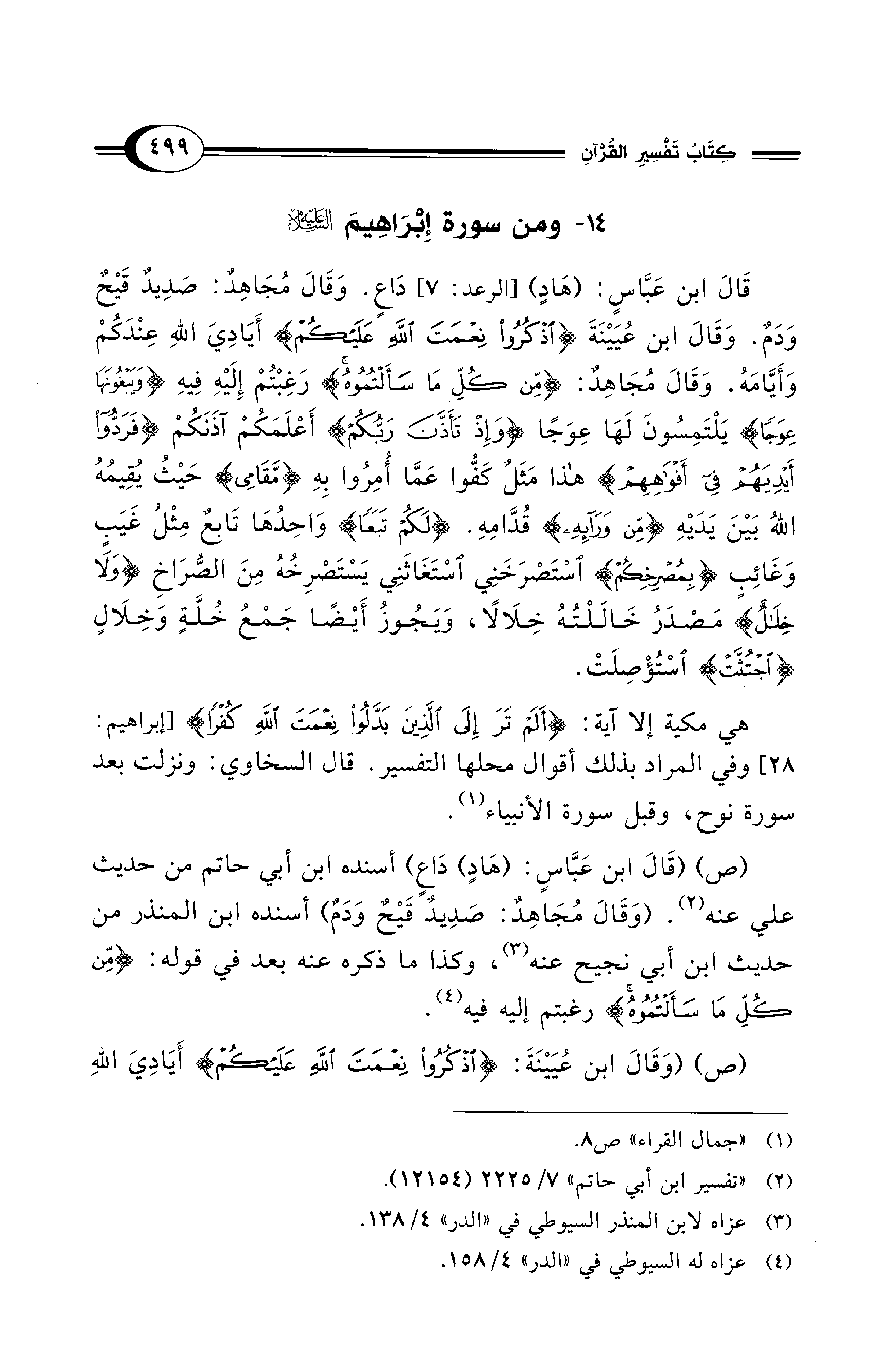 قَالَ ابن عَبَّاسٍ: (هَادٍ) [الرعد: 7] دَاعٍ. وَقَالَ مُجَاهِدٌ: صَدِيدٌ قَيْحٌ وَدَمٌ. وَقَالَ ابن عُيَيْنَةَ {اذْكُرُوا نِعْمَةَ اللهِ عَلَيْكُمْ} أَيَادِيَ اللهِ عِنْدَكُمْ وَأَيَّامَهُ. وَقَالَ مُجَاهِدٌ: {مِنْ كُلِّ مَا سَأَلْتُمُوهُ} رَغِبْتُمْ إِلَيْهِ فِيهِ {وَيَبْغُونَهَا عِوَجًا} يَلْتَمِسُونَ لَهَا عِوَجًا {وَإِذْ تَأَذَّنَ رَبُّكُمْ} أَعْلَمَكُمْ آذَنَكُمْ {فَرَدُّوا أَيْدِيَهُمْ فِي أَفْوَاهِهِمْ} هذا مَثَلٌ كَفُّوا عَمَّا أُمِرُوا بِهِ {مَّقَامِي} حَيْثُ يُقِيمُهُ اللهُ بَيْنَ يَدَيْهِ {مِنْ وَرَائِهِ} قُدَّامِهِ. {لَكُمْ تَبَعًا} وَاحِدُهَا تَابعٌ مِثْلُ غَيَبِ وَغَائِبٍ {بِمُصْرِخِكُمْ} اسْتَصْرَخَنِي اسْتَغَاثَنِي يَسْتَصْرِخُهُ مِنَ الصُّرَاخِ {وَلَا خِلَالٌ} مَصْدَرُ خَالَلْتُهُ خِلَالًا، وَيَجُوزُ أَيْضًا جَمْعُ خُلَّةٍ وَخِلَالٍ {اجْتُثَّتْ} اسْتُؤْصِلَتْ.