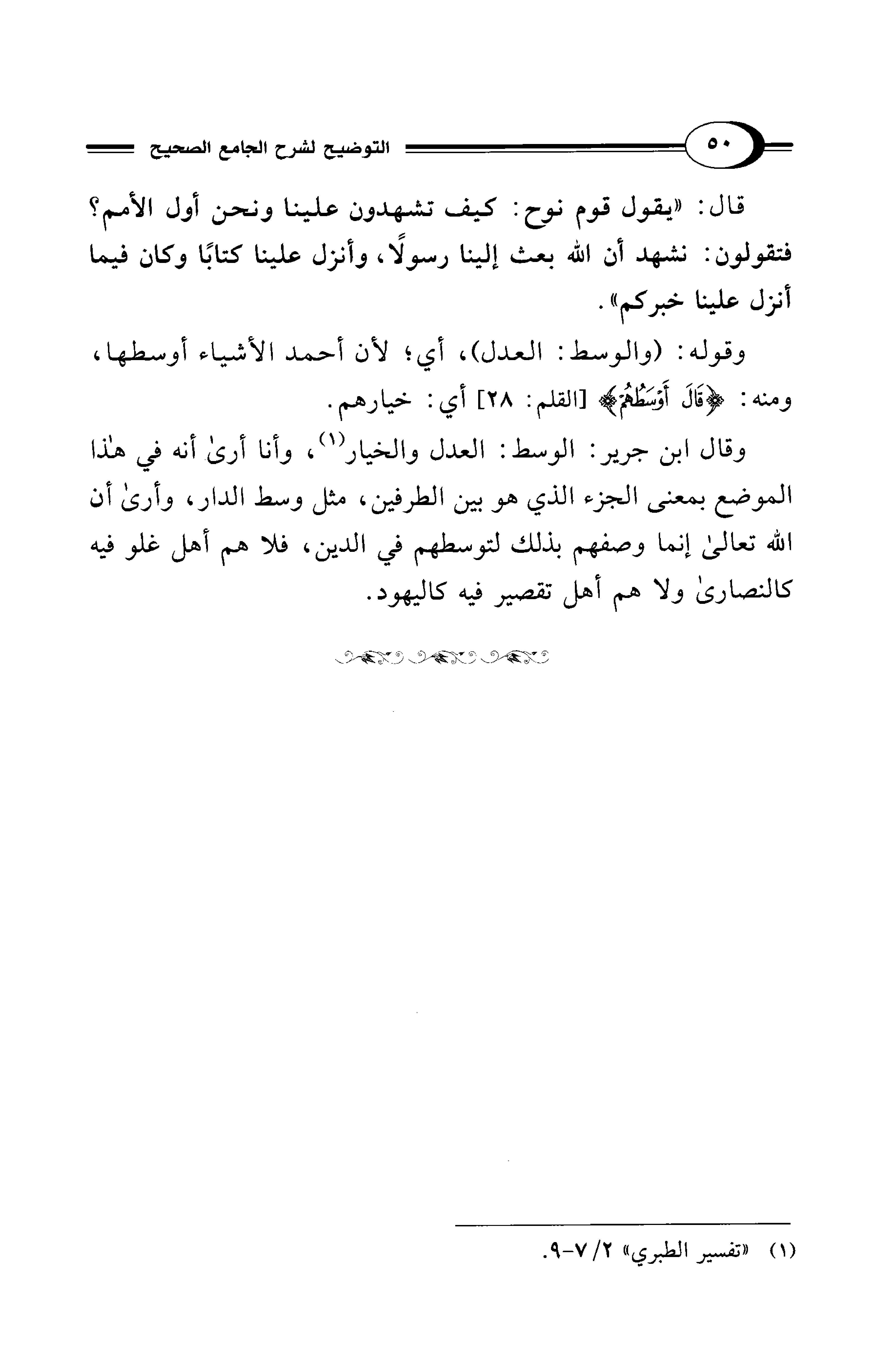 وقال ابن جرير: الوسط: العدل والخيار (¬1)، وأنا أرى أنه في هذا الموضع بمعنى الجزء الذي هو بين الطرفين، مثل وسط الدار، وأرى أن الله تعالئ إنما وصفهم بذلك لتوسطهم في الدين، فلا هم أهل غلو فيه كالنصارى ولا هم أهل تقصير فيه كاليهود.
