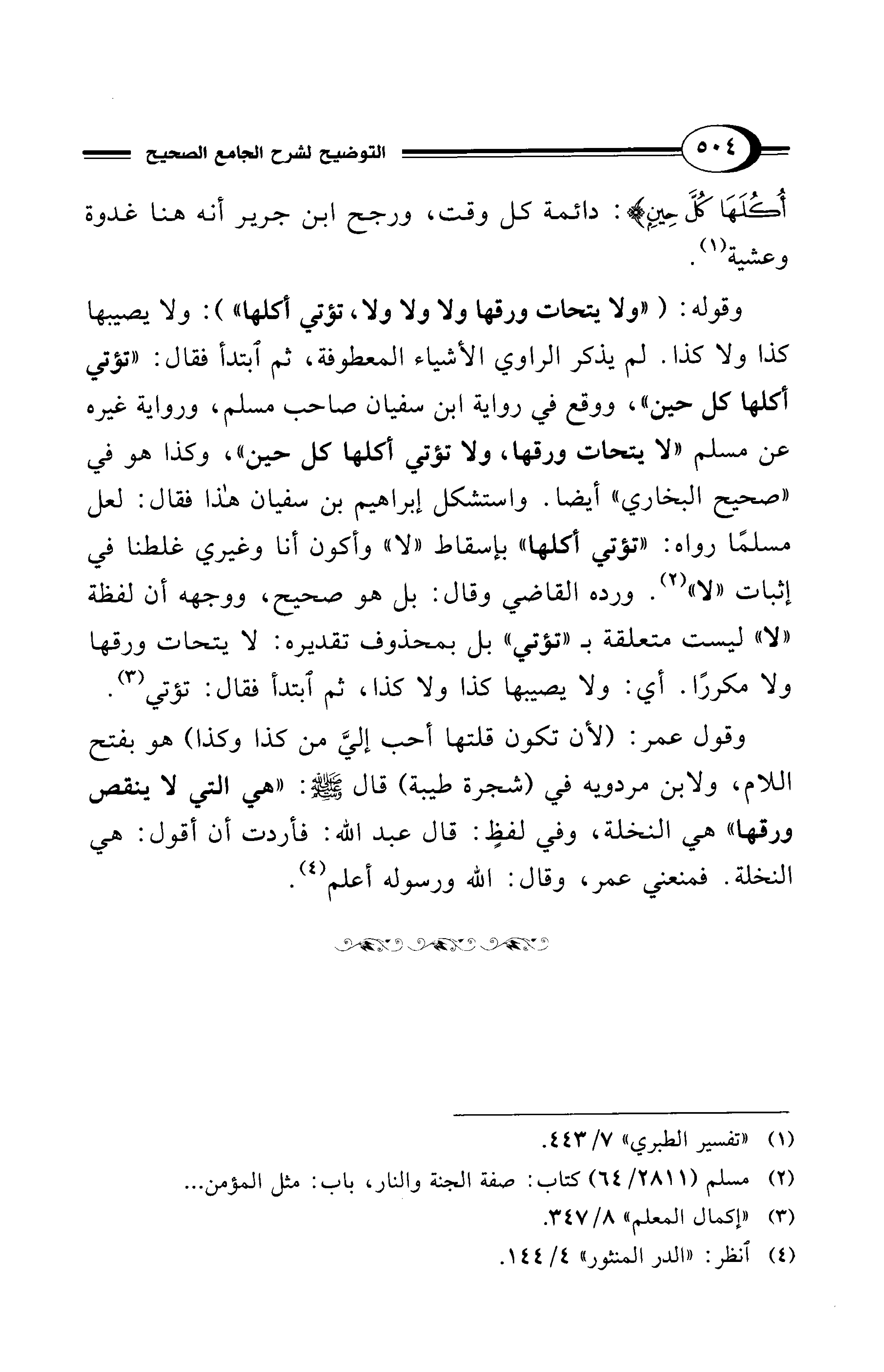وقوله: ("ولا يتحات ورقها ولا ولا ولا، تؤتي أكلها"): ولا يصيبها كذا ولا كذا. لم يذكر الراوي الأشياء المعطوفة، ثم ابتدأ فقال: "تؤتي أكلها كل حين"، ووقع في رواية ابن سفيان صاحب مسلم، ورواية غيره عن مسلم "لا يتحات ورقها، ولا تؤتي أكلها كل حين"، وكذا هو في "صحيح البخاري" أيضا. واستشكل إبراهيم بن سفيان هذا فقال: لعل مسلمًا رواه: "تؤتي أكلها" بإسقاط "لا" وأكون أنا وغيري غلطنا في إثبات "لا" (¬2). ورده القاضي وقال: بل هو صحيح، ووجهه أن لفظة "لا" ليست متعلقة بـ "تؤتي" بل بمحذوف تقديره: لا يتحات ورقها ولا مكررًا. أي: ولا يصيبها كذا ولا كذا، ثم ابتدأ فقال: تؤتي (¬3).