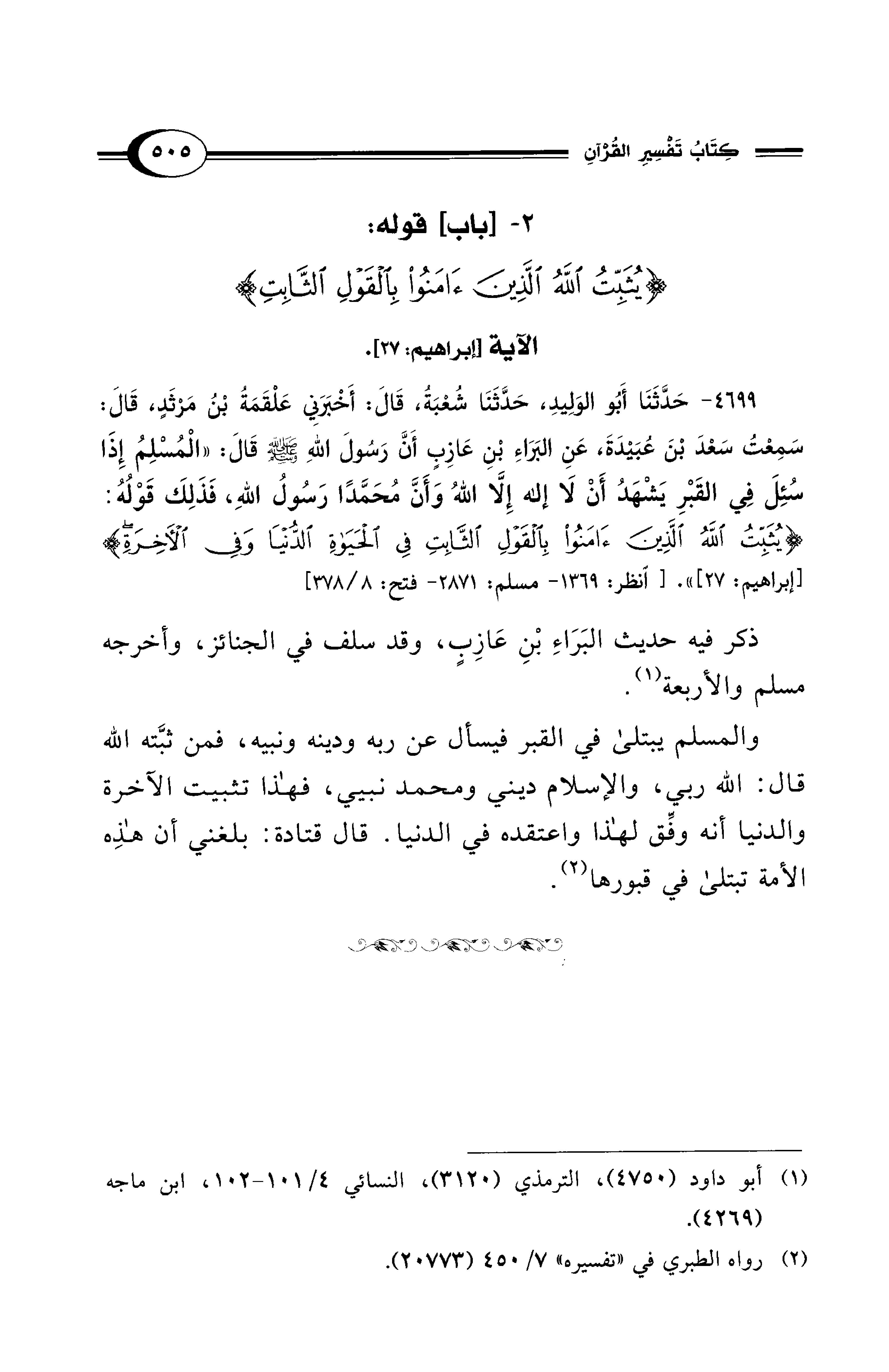 2 - [باب] قوله: {يُثَبِّتُ اللهُ الَّذِينَ آمَنُوا بِالْقَوْلِ الثَّابِتِ} الآية [إبراهيم: 27].