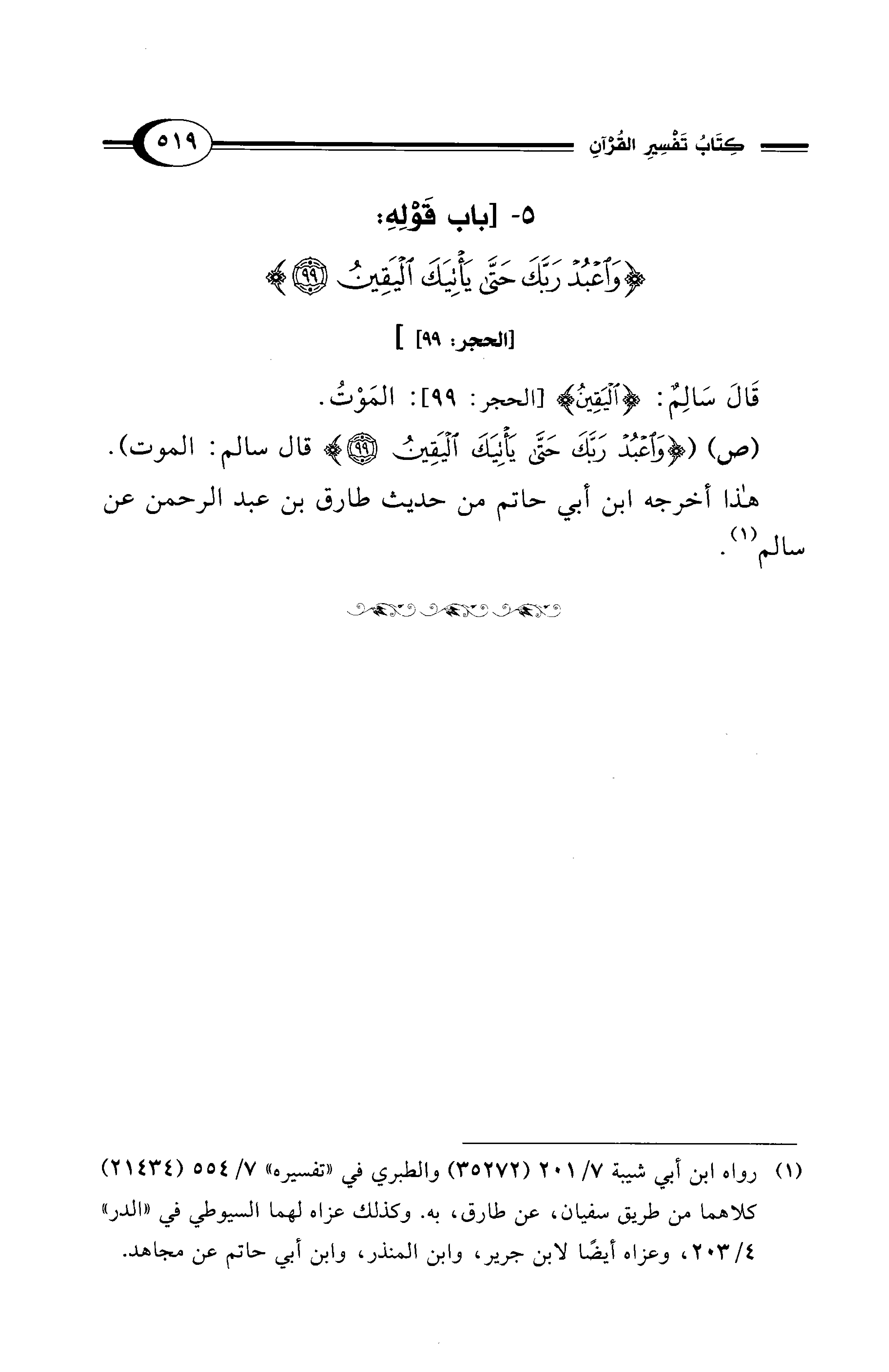(ص) ({وَاعْبُدْ رَبَّكَ حَتَّى يَأْتِيَكَ الْيَقِينُ (99)} قال سالم: الموت). هذا أخرجه ابن أبي حاتم من حديث طارق بن عبد الرحمن عن سالم (¬1).