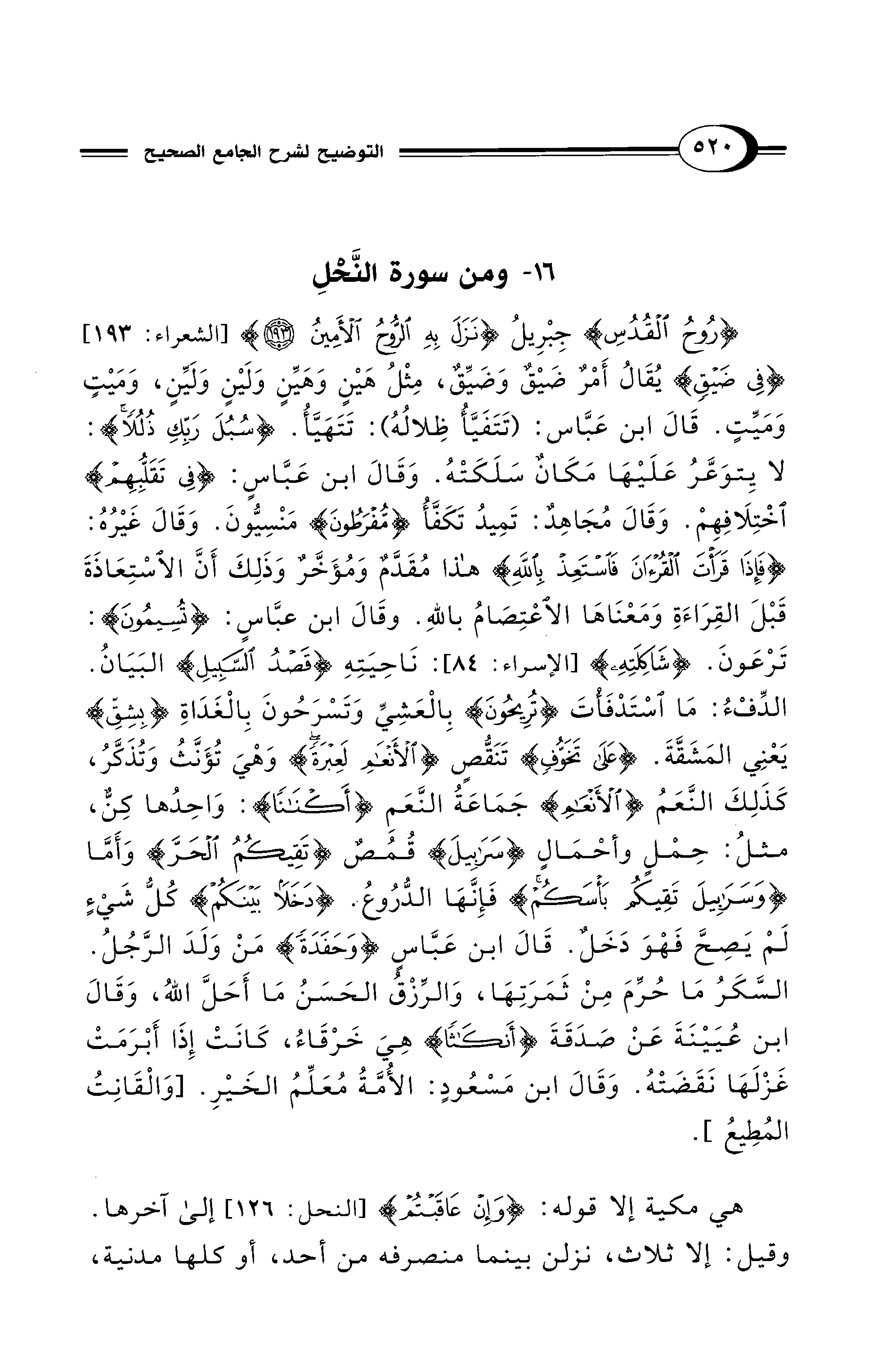 {رُوحُ الْقُدُسِ} جِبْرِيلُ {نَزَلَ بِهِ الرُّوحُ الْأَمِينُ (193)} [الشعراء: 193] {فِي ضَيْقٍ} يُقَالُ أَمْر ضَيْقٌ وَضَيِّقٌ، مِثْلُ هَيْنٍ وَهَيِّنٍ وَلَيْنٍ وَلَيِّنٍ، وَمَيْتٍ وَمَيِّتٍ. قَالَ ابن عَبَّاس: (تَتَفَيَّأُ ظِلالُهُ): تَتَهَيَّأُ. {سُبُلَ رَبِّكِ ذُلُلًا}: لا يِتوَعَّرُ عَلَيْهَا مَكَانٌ سَلَكَتْهُ. وَقَالَ ابن عَبَّاسٍ: {فِي تَقَلُّبِهِمْ} اخْتِلَافِهِمْ. وَقَالَ مُجَاهِدٌ: تَمِيدُ تَكَفَّأُ {مُفْرَطُونَ} مَنْسِيُّونَ. وَقَالَ غَيْرُهُ: {فَإِذَا قَرَأْتَ الْقُرْآنَ فَاسْتَعِذْ بِاللهِ} هذا مُقَدَّمٌ وَمُؤَخَّرٌ وَذَلِكَ أَنَّ الاسْتِعَاذَةَ قَبْلَ القِرَاءَةِ وَمَعْنَاهَا الاعْتِصَامُ باللهِ. وقَالَ ابن عبَّاسِ: {تُسِيمُونَ}: تَرْعَونَ. {شَاكِلَتِهِ} [الإسراء: 84]: نَاحِيَتِهِ {قَصْدُ السَّبِيلِ} البَيَانُ. الدِّفْءُ: مَا اسْتَدْفَأْتَ {تُرِيحُونَ} بِالْعَشِيِّ وَتَسْرَحُونَ بِالْغَدَاةِ {بِشِقِّ} يَعْنِي المَشَقَّةَ. {عَلَى تَخَوُّفٍ} تَنَقُّصٍ {الْأَنْعَامِ لَعِبْرَةً} وَهْيَ تُؤَنَّثُ وَتُذَكَّرُ، كَذَلِكَ النَّعَمُ {الْأَنْعَامِ} جَمَاعَةُ النَّعَمِ {أَكْنَانًا}: وَاحِدُها كِنٌّ، مثلُ: حِمْلٍ وأحْمَالٍ {سَرَابِيلَ} قُمُصٌ {تَقِيكُمُ الْحَرَّ} وَأَمَّا {وَسَرَابِيلَ تَقِيكُمْ بَأْسَكُمْ} فَإِنَّهَا الدُّرُوعُ. {دَخَلًا بَيْنَكُمْ} كُلُّ شَيْءٍ لَمْ يَصِحَّ فَهْوَ دَخَلٌ. قَالَ ابن عَبَّاسٍ {وَحَفَدَةً} مَنْ وَلَدَ الرَّجُلُ. السَّكَرُ مَا حُرِّمَ مِنْ ثَمَرَتِهَا، وَالرِّزْقُ الحَسَنُ مَا أَحَلَّ اللهُ، وَقَالَ ابن عُيَيْنَةَ عَنْ صَدَقَةَ {أَنْكَاثًا} هِيَ خَرْقَاءُ، كَانَتْ إِذَا أَبْرَمَتْ غَزْلَهَا نَقَضَتْهُ. وَقَالَ ابن مَسْعُودٍ: الأُمَّةُ مُعَلِّمُ الخَيْرِ. [وَالْقَانِتُ المُطِيعُ].