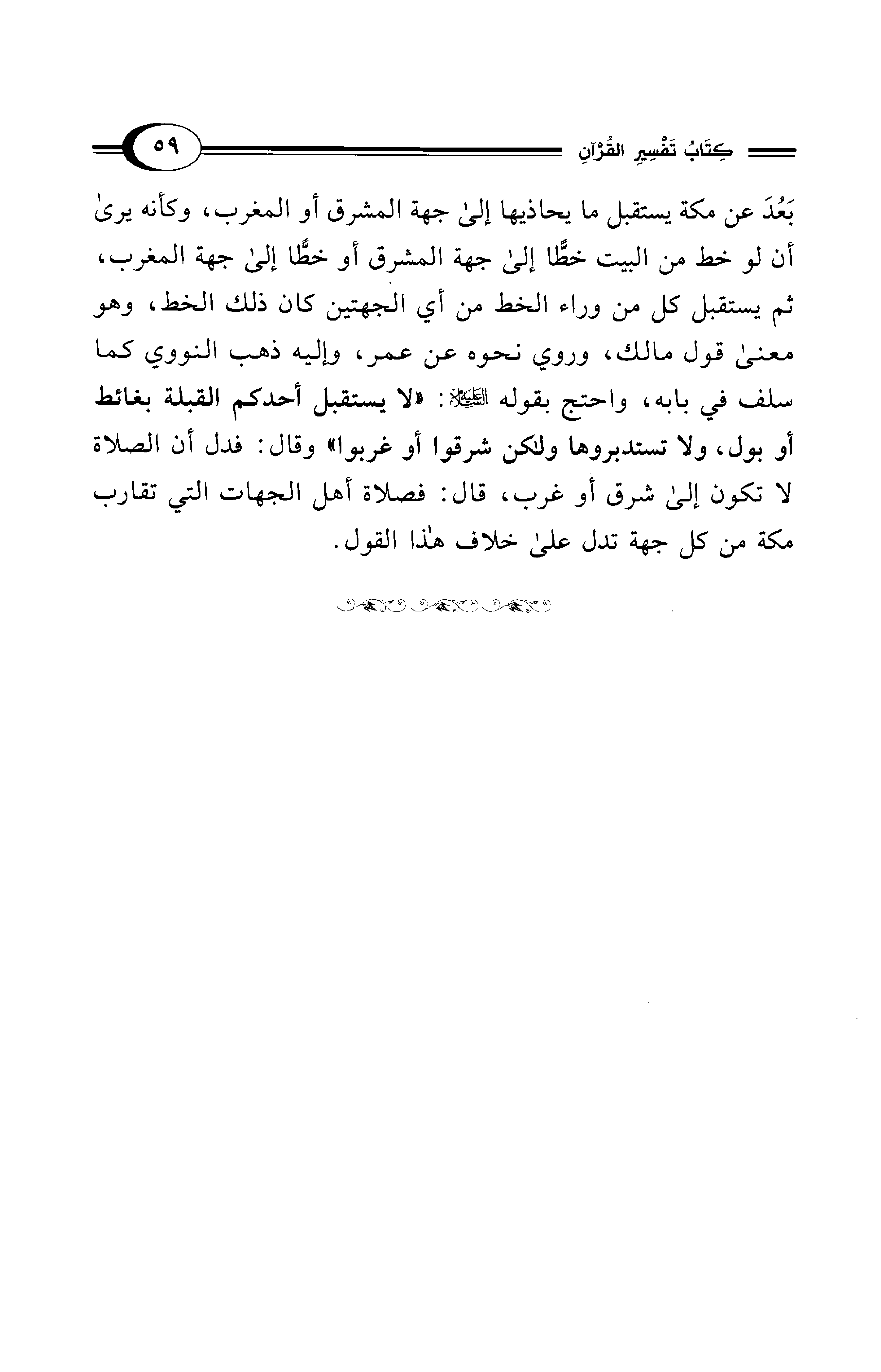 بَعُدَ عن مكة يستقبل ما يحاذيها إلى جهة المشرق أو المغرب، وكأنه يرى أن لو خط من البيت خطًّا إلى جهة المشرق أو خطًّا إلى جهة المغرب، ثم يستقبل كل من وراء الخط من أي الجهتين كان ذلك الخط، وهو معنى قول مالك، وروي نحوه عن عمر، وإليه ذهب النووي كما سلف في بابه، واحتج بقوله - عليه السلام -: "لا يستقبل أحدكم القبلة بغائط أو بول، ولا تستدبروها ولكن شرقوا أو غربوا" وقال: فدل أن الصلاة لا تكون إلى شرق أو غرب، قال: فصلاة أهل الجهات التي تقارب مكة من كل جهة تدل على خلاف هذا القول.