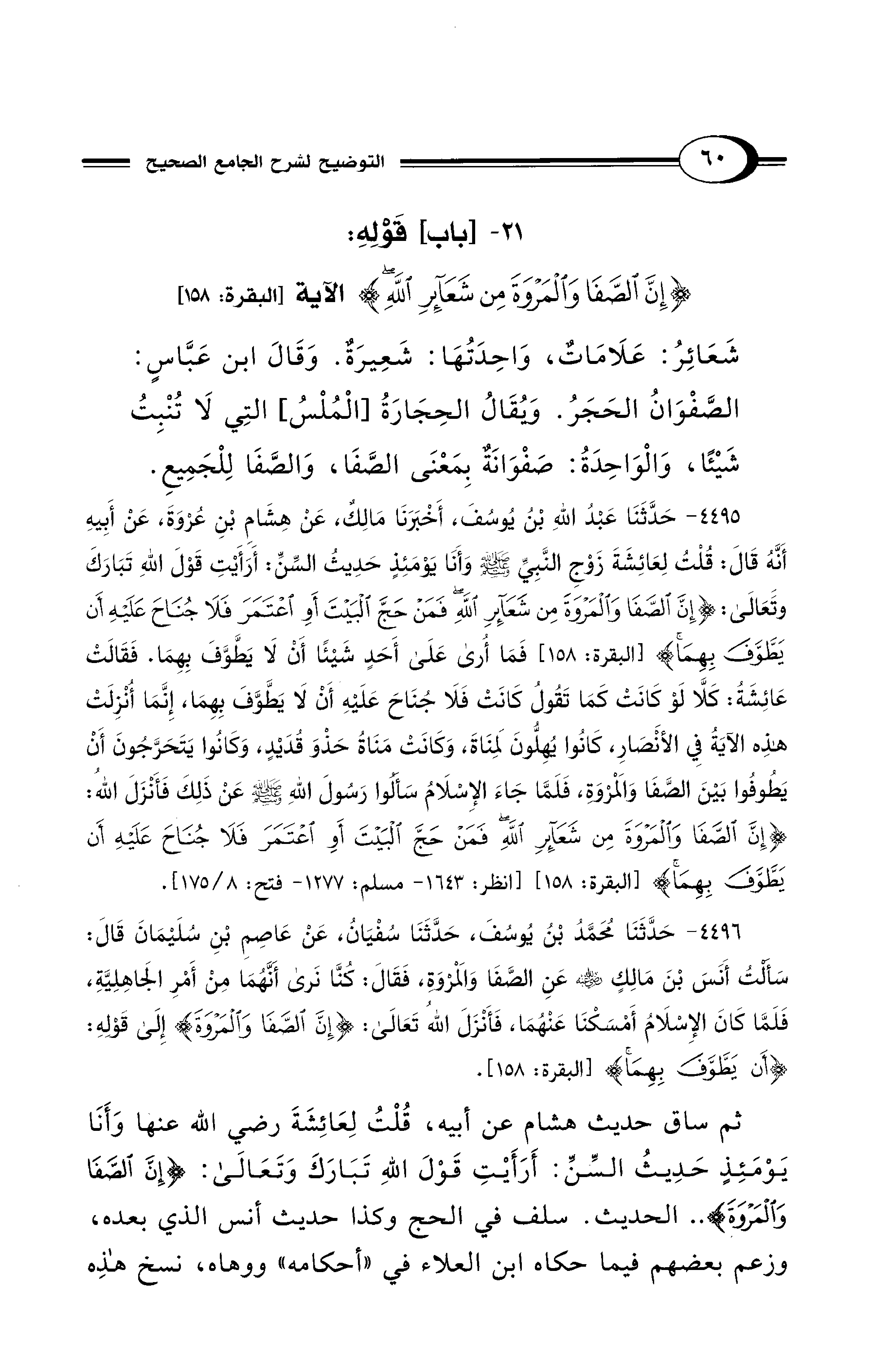 21 - [باب] قَوْلِهِ: {إِنَّ الصَّفَا وَالْمَرْوَةَ مِنْ شَعَائِرِ اللَّهِ} الآية [البقرة: 158]