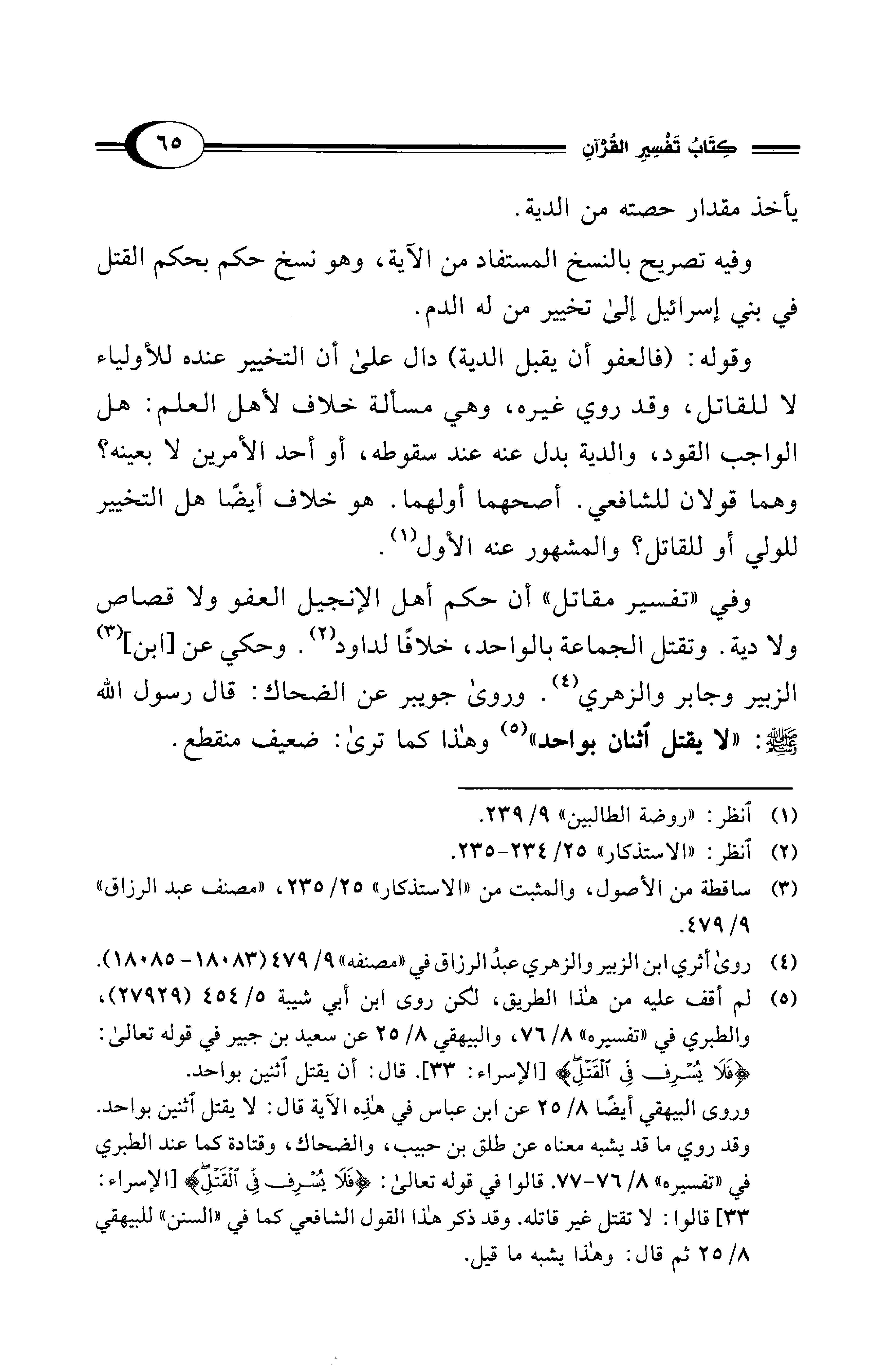 (¬5) لم أقف عليه من هذا الطريق، لكن روى ابن أبي شيبة 5/ 454 (27929)، والطبري في "تفسيره" 8/ 76، والبيهقي 8/ 25 عن سعيد بن جبير في قوله تعالى: {فَلَا يُسْرِفْ فِي الْقَتْلِ} [الإسراء: 33]. قال: أن يقتل اثنين بواحد.