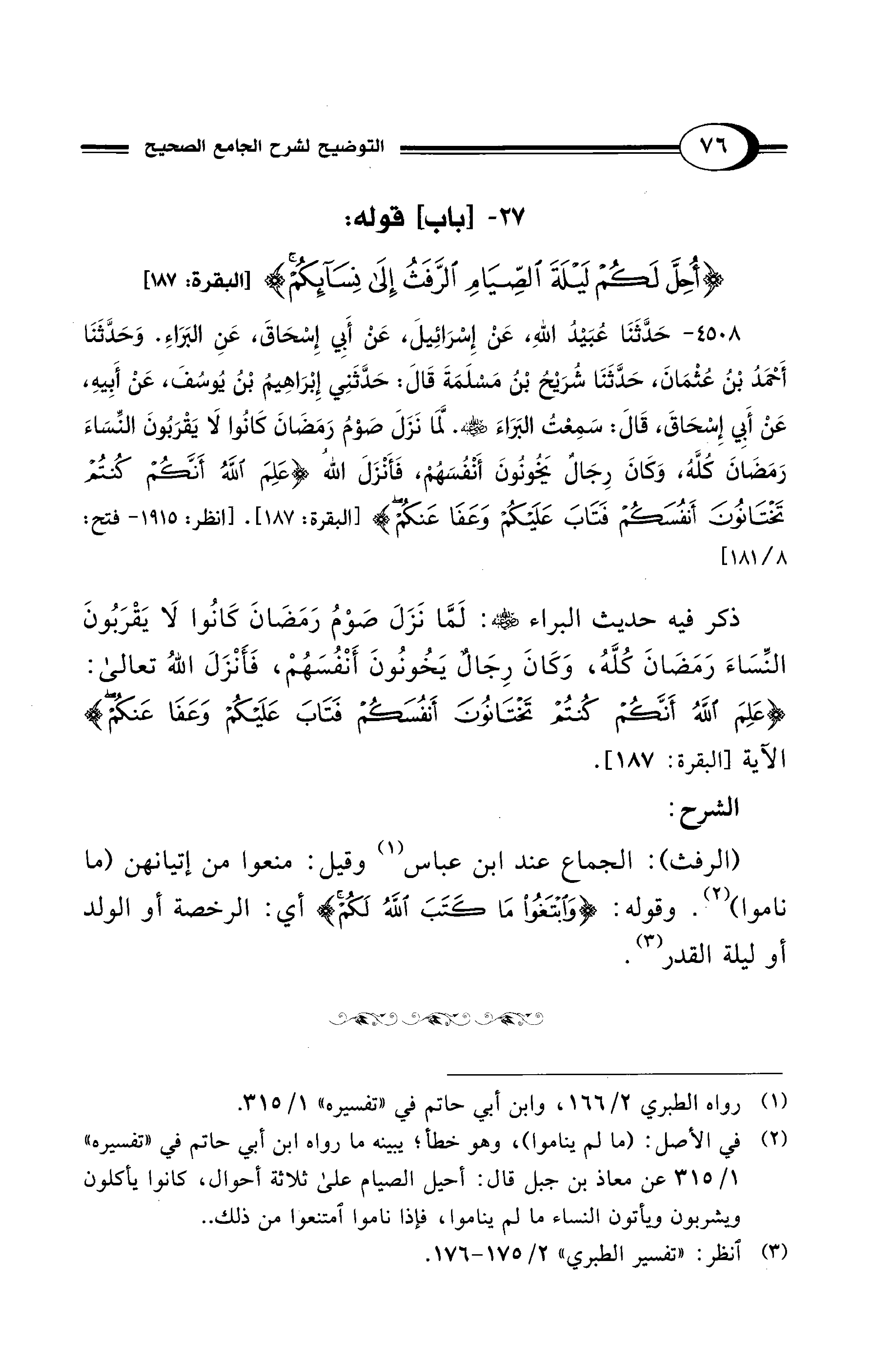 27 - [باب] قوله: {أُحِلَّ لَكُمْ لَيْلَةَ الصِّيَامِ الرَّفَثُ إِلَى نِسَائِكُمْ} [البقرة: 187]