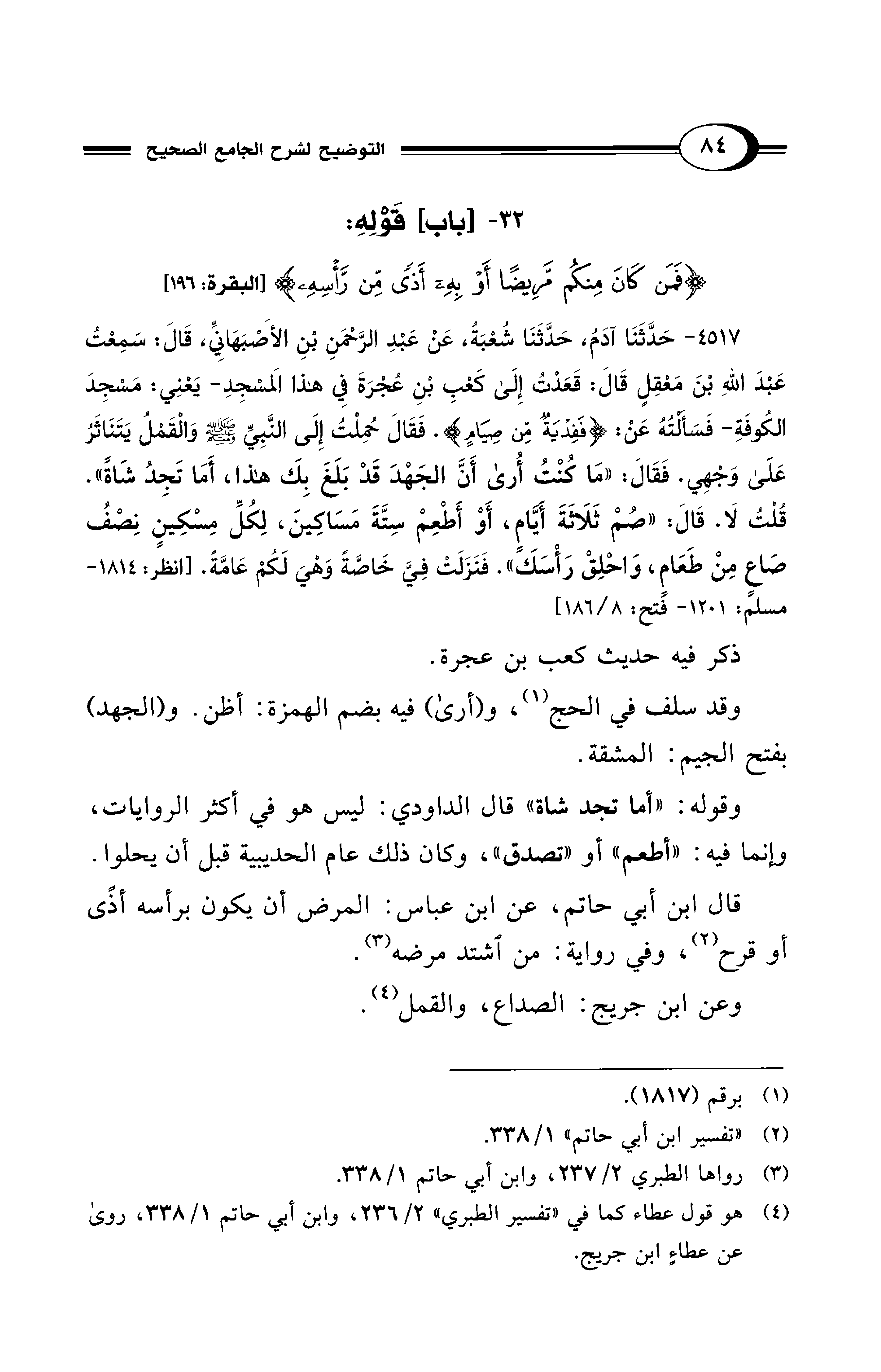 32 - [باب] قَولِهِ: {فَمَنْ كَانَ مِنْكُمْ مَرِيضًا أَوْ بِهِ أَذًى مِنْ رَأْسِهِ} [البقرة:196]