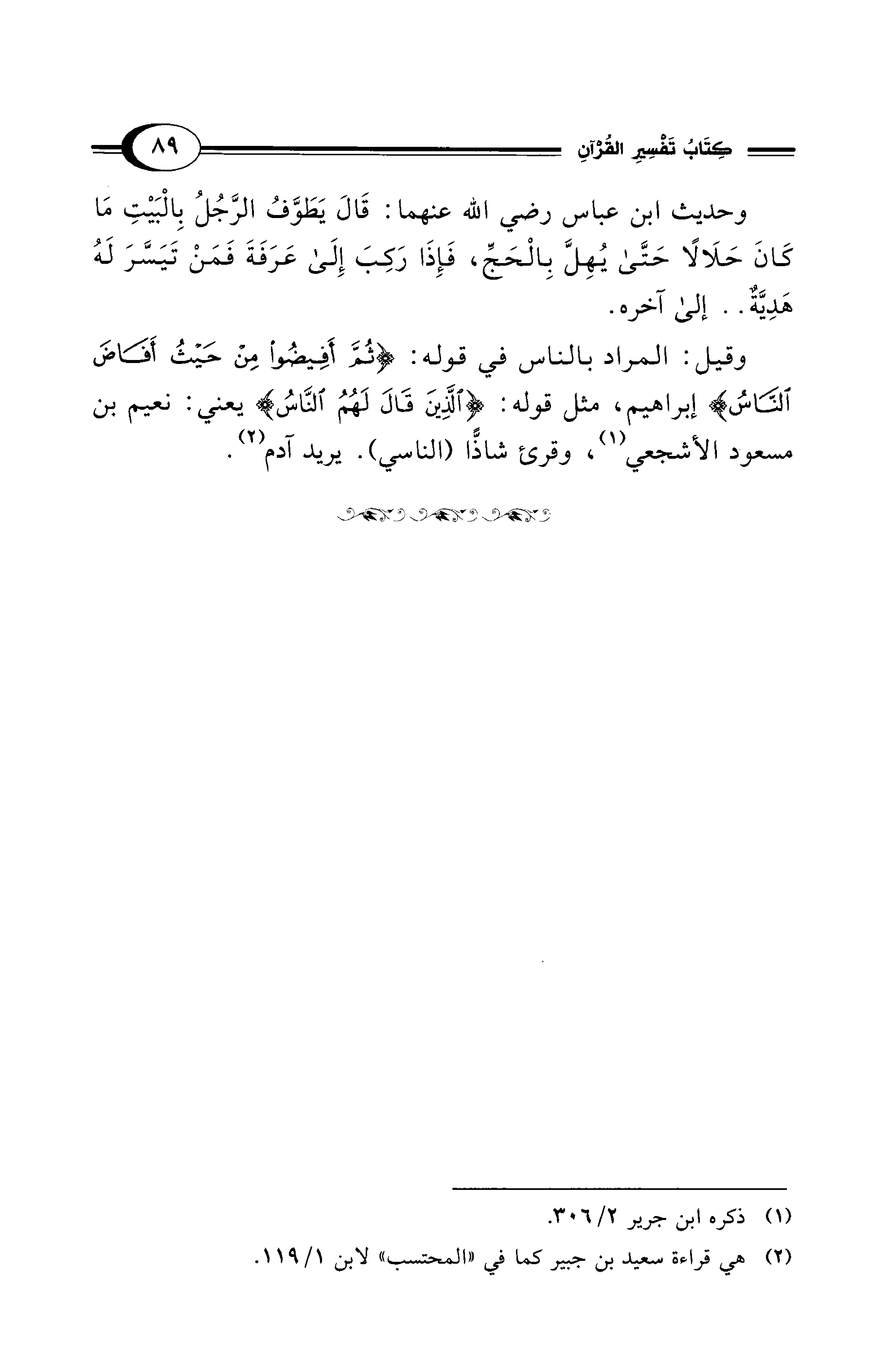 وقيل: المراد بالناس في قوله: {ثُمَّ أَفِيضُوا مِنْ حَيْثُ أَفَاضَ النَّاسُ} إبراهيم، مثل قوله: {الَّذِينَ قَالَ لَهُمُ النَّاسُ} يعني: نعيم بن مسعود الأشجعي (¬1)، وقرئ شاذًّا (الناسي). يريد آدم (¬2).