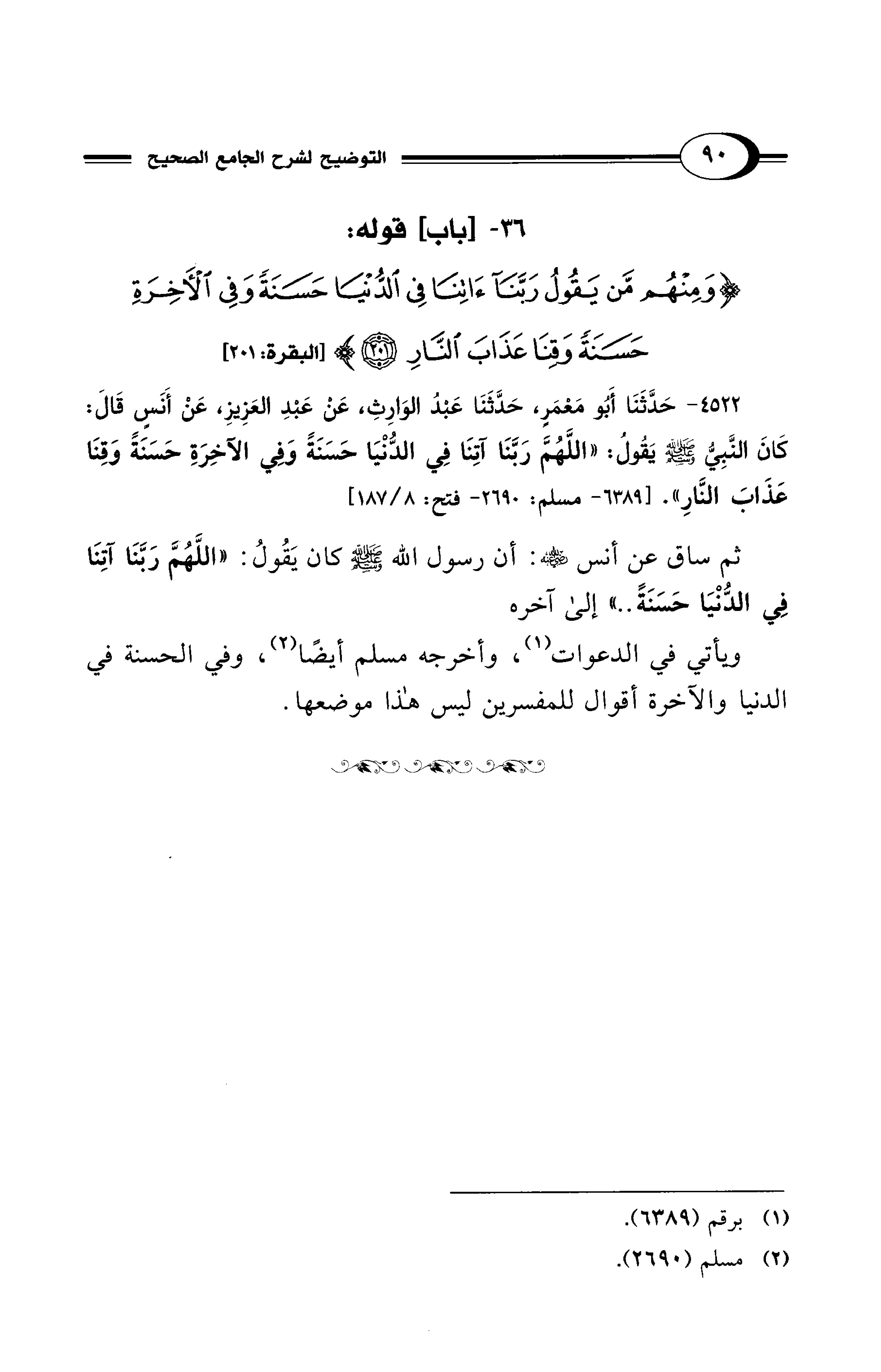 36 - [باب] قوله: {وَمِنْهُمْ مَنْ يَقُولُ رَبَّنَا آتِنَا فِي الدُّنْيَا حَسَنَةً وَفِي الْآخِرَةِ حَسَنَةً وَقِنَا عَذَابَ النَّارِ (201)} [البقرة: 201]