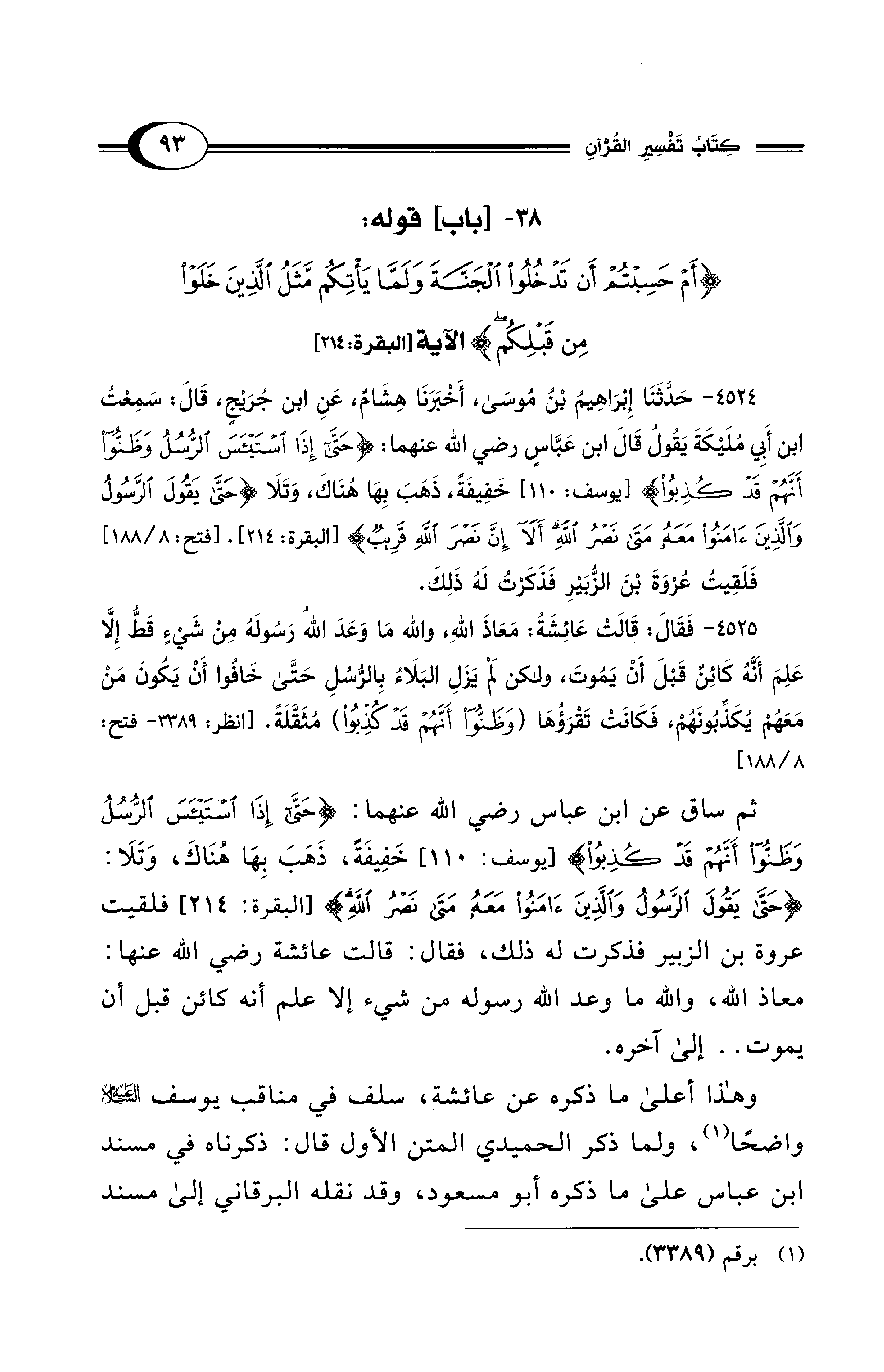 ثم ساق عن ابن عباس رضي الله عنهما: {حَتَّى إِذَا اسْتَيْأَسَ الرُّسُلُ وَظَنُّوا أَنَّهُمْ قَدْ كُذِبُوا} [يوسف: 110] خَفِيفَةً، ذَهَبَ بِهَا هُنَاكَ، وَتَلَا: {حَتَّى يَقُولَ الرَّسُولُ وَالَّذِينَ آمَنُوا مَعَهُ مَتَى نَصْرُ اللهِ} [البقرة: 214] فلقيت عروة بن الزبير فذكرت له ذلك، فقال: قالت عائشة رضي الله عنها: معاذ الله، والله ما وعد الله رسوله من شيء إلا علم أنه كائن قبل أن يموت .. إلى آخره.